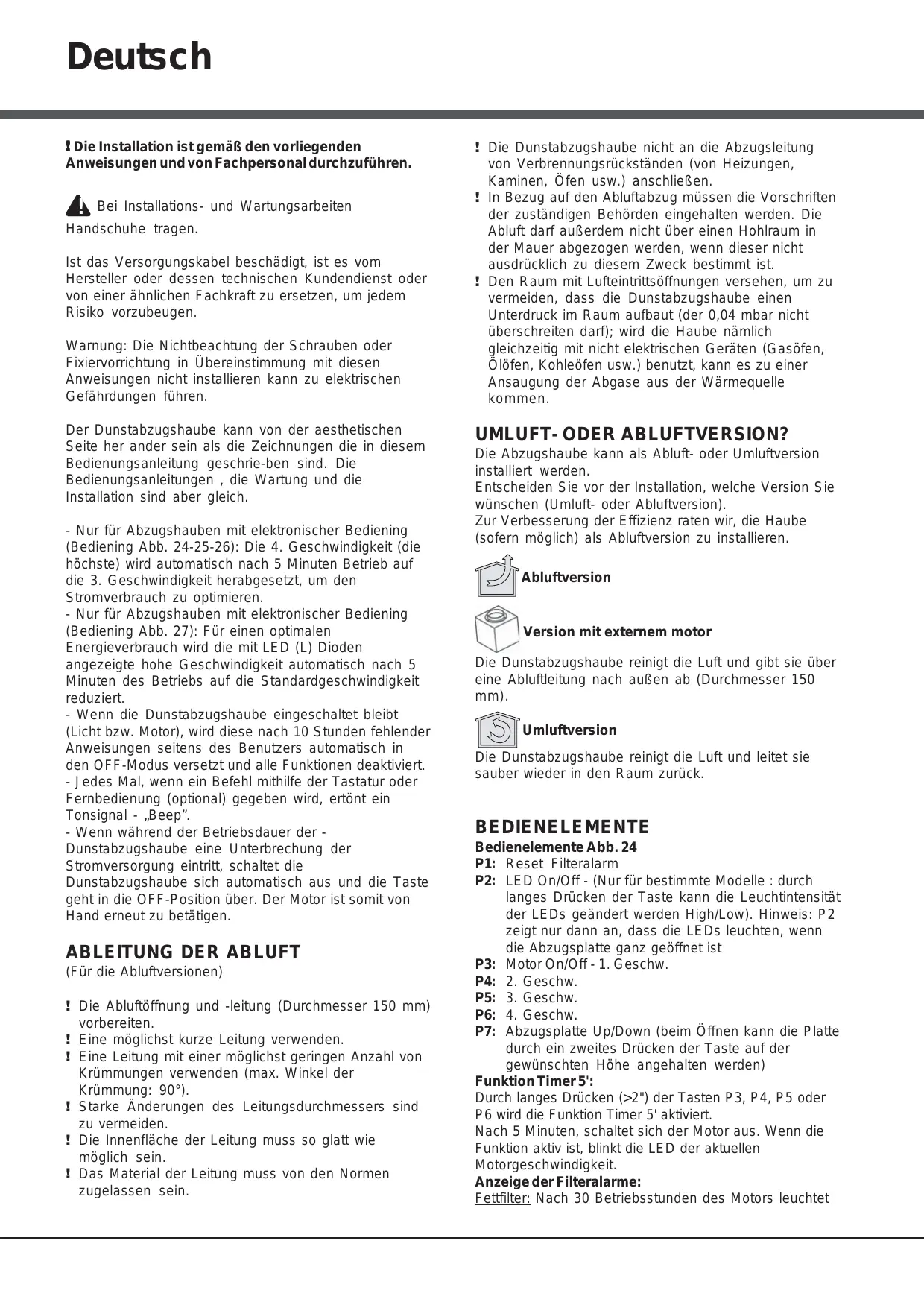 Der Dunstabzugshaube kann von der aesthetischen Seite her ander sein als die Zeichnungen die in thisem Bedienungsanleitung geschrie-ben sind. Die Bedienungsanleitungen, die Wartung und die Installation sind aber gleich.