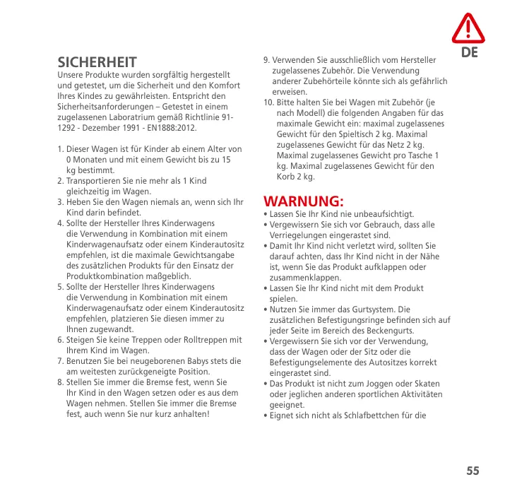 (1) Les produits achetés auprès de détaillants ou de revendeurs qui ôtent ou changent les étiquettes ou les numéros d’identifications sont considérés comme non autorisés. Aucune garantie ne s’applique à ces produits puisque l’authenticité de ces produits ne peut pas être vérifiée. SICHERHEIT Unsere Produkte wurden sorgfältig hergestellt und getestet, um die Sicherheit und den Komfort Ihres Kindes zu gewährleisten. Entspricht den Sicherheitsanforderungen – Getestet in einem zugelassenen Laboratrium gemäß Richtlinie 911292 - Dezember 1991 - EN1888:2012.