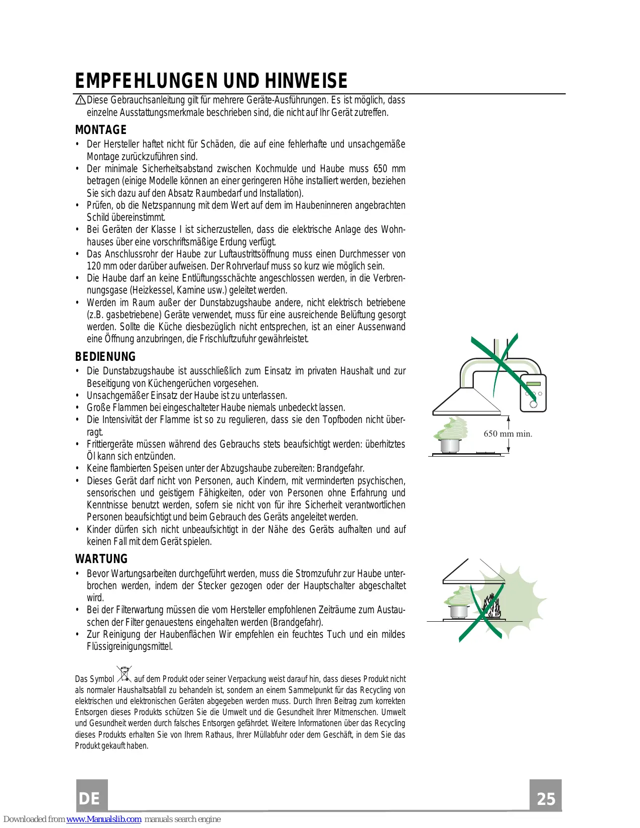 WARTUNG • Bevor Wartungsarbeiten durchgeführt werden, muss die Stromzufuhr zur Haube unterbrochen werden, indem der Stecker gezogen oder der Hauptschalter abgeschaltet wird. • Bei der Filterwartung müssen die vom Hersteller empfohlenen Zeiträume zum Austauschen der Filter genauestens eingehalten werden (Brandgefahr). • Zur Reinigung der Haubenflächen Wir empfehlen ein feuchtes Tuch und ein mildes Flüssigreinigungsmittel. Das Symbol auf dem Produkt oder seiner Verpackung weist darauf hin, dass dieses Produkt nicht als normaler Haushaltsabfall zu behandeln ist, sondern an einem Sammelpunkt für das Recycling von elektrischen und elektronischen Geräten abgegeben werden muss. Durch Ihren Beitrag zum korrekten Entsorgen dieses Produkts schützen Sie die Umwelt und die Gesundheit Ihrer Mitmenschen. Umwelt und Gesundheit werden durch falsches Entsorgen gefährdet. Weitere Informationen über das Recycling dieses Produkts erhalten Sie von Ihrem Rathaus, Ihrer Müllabfuhr oder dem Geschäft, in dem Sie das Produkt gekauft haben.
