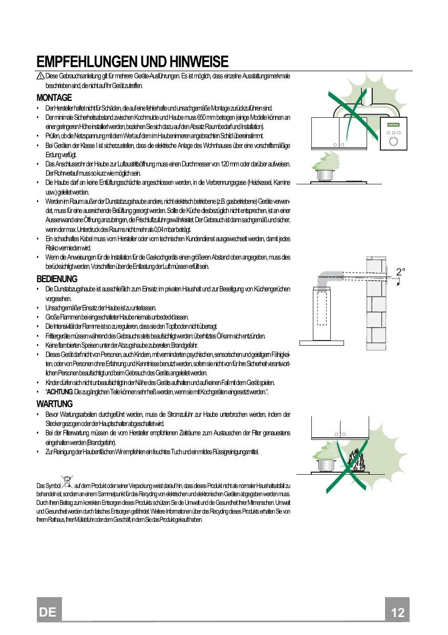 INHALTSVERZEICHNIS DE EMPFEHLUNGEN UND HINWEISE12 ALLGEMEINES - SICHERHEITSHINWEISE13 MONTAGE14 BEDIENUNG - WARTUNG15