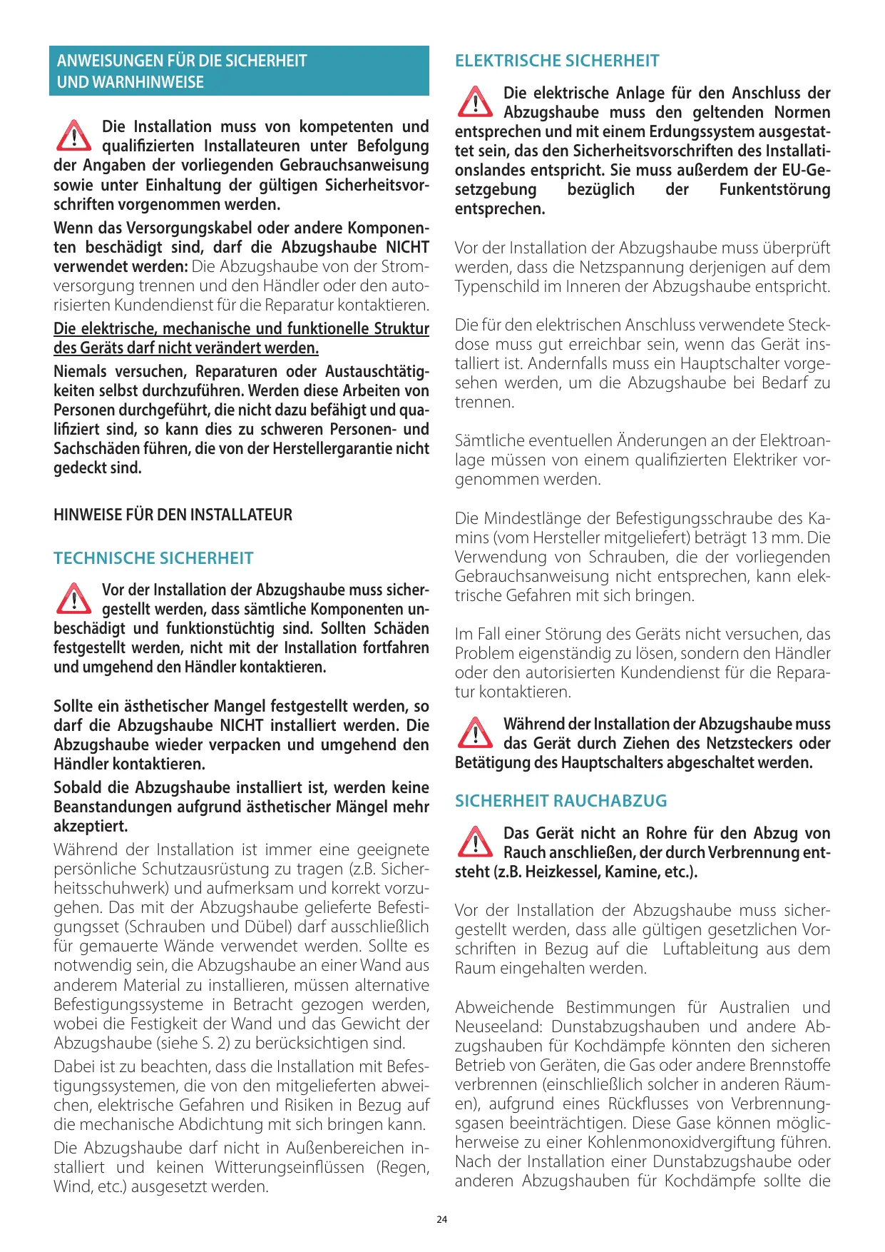 Die Mindestlänge der Befestigungsschraube des Kamins (vom Hersteller mitgeliefert) beträgt 13 mm. Die Verwendung von Schrauben, die der vorliegenden Gebrauchsanweisung nicht entsprechen, kann elektrische Gefahren mit sich bringen. TECHNISCHE SICHERHEIT Vor der Installation der Abzugshaube muss sichergestellt werden, dass sämtliche Komponenten unbeschädigt und funktionstüchtig sind. Sollten Schäden festgestellt werden, nicht mit der Installation fortfahren und umgehend den Händler kontaktieren. Im Fall einer Störung des Geräts nicht versuchen, das Problem eigenständig zu lösen, sondern den Händler oder den autorisierten Kundendienst für die Reparatur kontaktieren. Sollte ein ästhetischer Mangel festgestellt werden, so darf die Abzugshaube NICHT installiert werden. Die Abzugshaube wieder verpacken und umgehend den Händler kontaktieren. Sobald die Abzugshaube installiert ist, werden keine Beanstandungen aufgrund ästhetischer Mängel mehr akzeptiert. Während der Installation ist immer eine geeignete persönliche Schutzausrüstung zu tragen (z.B. Sicherheitsschuhwerk) und aufmerksam und korrekt vorzugehen. Das mit der Abzugshaube gelieferte Befestigungsset (Schrauben und Dübel) darf ausschließlich für gemauerte Wände verwendet werden. Sollte es notwendig sein, die Abzugshaube an einer Wand aus anderem Material zu installieren, müssen alternative Befestigungssysteme in Betracht gezogen werden, wobei die Festigkeit der Wand und das Gewicht der Abzugshaube (siehe S. 2) zu berücksichtigen sind. Dabei ist zu beachten, dass die Installation mit Befestigungssystemen, die von den mitgelieferten abweichen, elektrische Gefahren und Risiken in Bezug auf die mechanische Abdichtung mit sich bringen kann. Die Abzugshaube darf nicht in Außenbereichen installiert und keinen Witterungseinflüssen (Regen, Wind, etc.) ausgesetzt werden. Während der Installation der Abzugshaube muss das Gerät durch Ziehen des Netzsteckers oder Betätigung des Hauptschalters abgeschaltet werden. SICHERHEIT RAUCHABZUG Das Gerät nicht an Rohre für den Abzug von Rauch anschließen, der durch Verbrennung entsteht (z.B. Heizkessel, Kamine, etc.). Vor der Installation der Abzugshaube muss sichergestellt werden, dass alle gültigen gesetzlichen Vorschriften in Bezug auf die Luftableitung aus dem Raum eingehalten werden. Abweichende Bestimmungen für Australien und Neuseeland: Dunstabzugshauben und andere Abzugshauben für Kochdämpfe könnten den sicheren Betrieb von Geräten, die Gas oder andere Brennstoffe verbrennen (einschließlich solcher in anderen Räumen), aufgrund eines Rückflusses von Verbrennungsgasen beeinträchtigen. Diese Gase können möglicherweise zu einer Kohlenmonoxidvergiftung führen. Nach der Installation einer Dunstabzugshaube oder anderen Abzugshauben für Kochdämpfe sollte die
