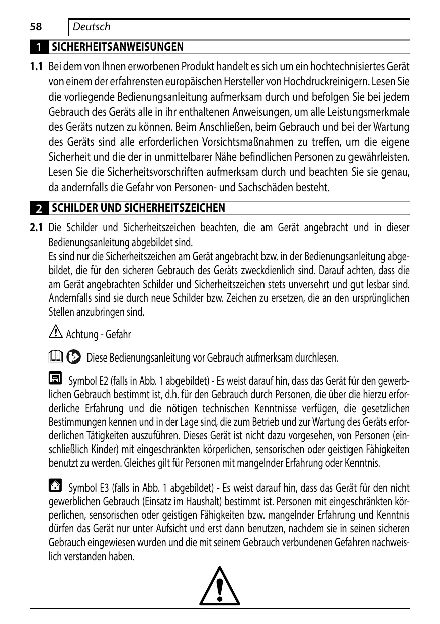 EN 62233; EN 50581 Sen henkilön nimi ja osoite, joka on valtuutettu kokoamaan teknisen eritelmän: Stefano Reverberi / AR Toimitusjohtaja Via M.L. King 3 - 41122 Modena, Italia Direktiivissä 2000/14/EY vaadittu vaatimustenmukaisuuden arviointimenettely on toteutettu liitteen V mukaan. Mallinro 2.1 Respecter les pictogrammes de sécurité et les symboles figurant sur l'appareil et dans ce manuel. Seuls les symboles concernant l'appareil acheté sont reproduits sur l'appareil et dans le manuel. S'assurer que les symboles et les pictogrammes de sécurité sur l'appareil sont lisibles et en bon état. Dans le cas contraire, les remplacer en respectant la position d'origine. Attention - Danger Lire attentivement ces instructions avant emploi. Icône E2 (si le symbole est présent sur fig. 1) - Elle indique que l'appareil est conçu pour un usage professionnel, c'est-à-dire pour les personnes qui ont de l'expérience, la connaissance technique, normative, législative et qui sont en mesure d'exécuter les opérations nécessaires à l'utilisation et à la maintenance de l'appareil. Cet appareil ne doit pas être utilisé par des personnes (enfants inclus) dont les capacités physiques, sensorielles ou mentales sont réduites, ou par des personnes sans expérience ni formation. Icône E3 (si le symbole est présent sur fig. 1) - Elle indique que l'appareil est conçu pour un usage non professionnel (domestique). Il peut être utilisé par des personnes aux capacités physiques, sensorielles ou mentales réduites, ou manquant d'expérience ou de connaissance, à partir du moment où elles sont surveillées ou ont reçu des explications permettant d'utiliser l'appareil en toute sécurité et comprennent les risques impliqués. Organes en mouvement. Ne pas toucher.