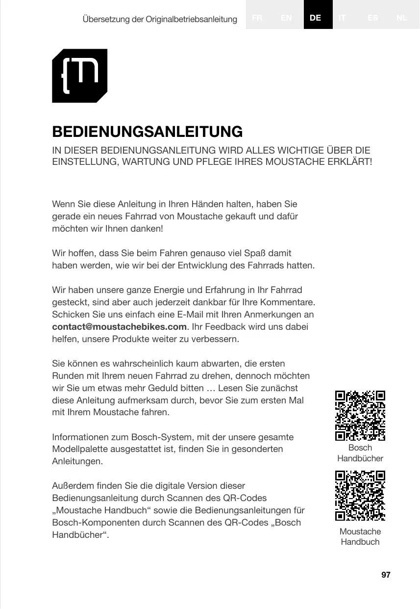 Außer dem finden Sie die digitale Version dieser Bedienungsanleitung durch Scannen des QR-Codes „Moustache Handbuch" sowie die Bedienungsanleitungen für Bosch-Komponenten durch Scannen des QR-Codes „Bosch Handbücher".