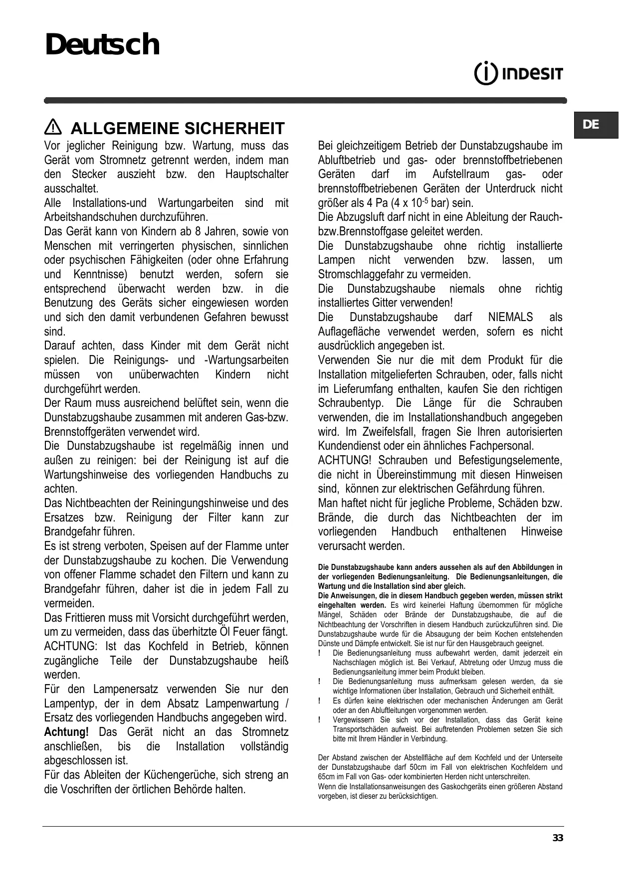Les enfants doivent être surveillés pour s'assurer qu'ils ne jouent pas avec l'appareil. Le nettoyage et l'entretien ne doivent pas être effectués par des enfants sans surveillance. La pièce doit avoir une aération suffisante lorsque la hotte est utilisée conjointement avec d'autres appareils fonctionnant au gaz ou autres combustibles. La hotte doit être régulièrement nettoyée à la fois à l'intérieur et à l'extérieur (AU MOINS UNE FOIS PAR MOIS); cela devrait se faire en conformité avec les instructions d'entretien dans ce manuel. Le non respect des instructions expressément fournies dans ce mode d'emploi concernant le nettoyage de la hotte et des filtres peut provoquer des risques d'incendie. Il est strictement interdit de flamber les aliments sous la hotte. L'utilisation d'une flamme nue est dommageable pour les filtres et peut causer un incendie, par conséquent, elles doivent être évitées de toute façon. La friture doit être faite avec soin afin de s’assurer que l’huile surchauffée ne prend pas feu. AVERTISSEMENT: Lorsque la table de cuisson est en fonctionnement, les parties accessibles de la hotte peuvent devenir très chaudes. Pour le remplacement de la lampe, utilisez uniquement le type de lampe spécifié dans la section remplacement/maintenance lampe dans ce manuel. Attention! Ne pas brancher l'appareil au réseau électrique avant que l'installation est complètement terminée. En ce qui concerne les mesures techniques et de sécurité à prendre pour l'évacuation des fumées, respectez strictement les dispositions des règlements locales.