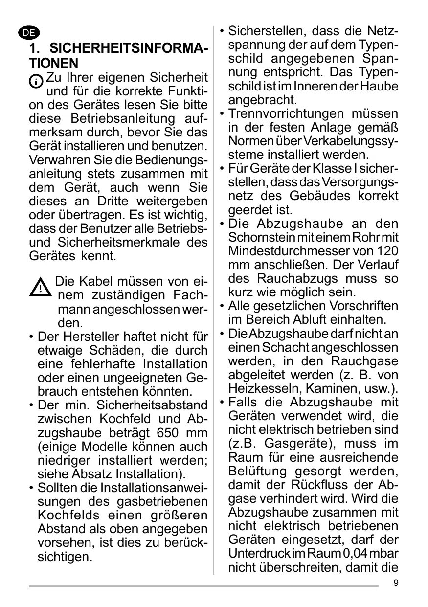 1. SICHERHEITSINFORMATIONEN Zu Ihrer eigenen Sicherheit und für die korrekte Funktion des Gerätes lesen Sie bitte diese Betriebsanleitung aufmerksam durch, bevor Sie das Gerät installieren und benutzen. à une installation ou à une utilisation impropre. Ladistancedesécuritéminimum entre le plan de cuisson et la hotte aspirante est de 650 mm • (certains modèles peuvent être installés à une hauteur inférieure ; voir le paragraphe concernant les dimensions de travail et l’installation). Si les instructions d’installation du plan de cuisson à gaz spécifient une distance supérieure à celle indiquée cidessus, veuillez impérativement en tenir compte. Assurez-vous que la tension