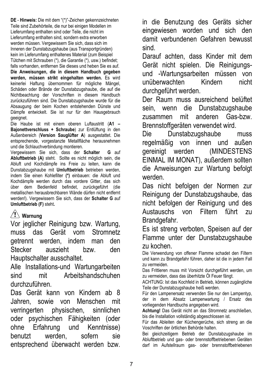La limpieza y el mantenimiento no deben ser realizados por niños sin debida supervisión. La habitación debe estar suficientemente ventilada cuando la campana se utiliza contemporáneamente con otros dispositivos a combustión de gas u otros combustibles. La campana debe ser limpiada con frecuencia, tanto internamente como externamente (POR LO MENOS UNA VEZ AL MES), en todo caso seguir lo que se indica expresamente en las instrucciones de mantenimiento. La inobservancia de las normas de limpieza de la campana y del cambio y la limpieza puede comportar riesgo de incendios. Es estrictamente prohibido flamear los alimentos bajo la campana.