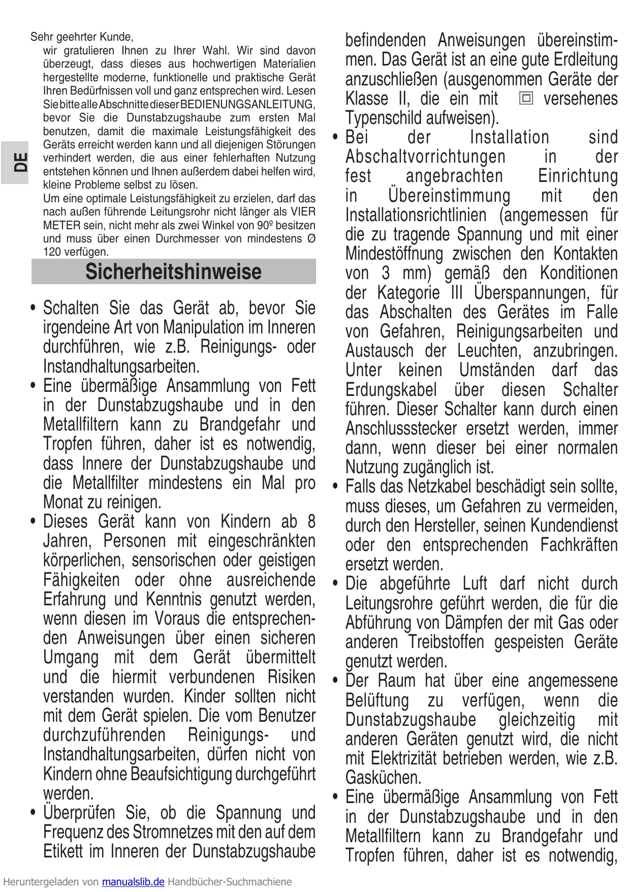 • L’accumulation excessive de graisse dans la hotte et les filtres métalliques peut entraîner des risques d’incendie et d’égouttement, c’est pourquoi il est impératif de laver l’intérieur de la hotte et les filtres métalliques au moins une fois par mois. • Cet appareil peut être utilisé par des enfants de plus de 8 ans et par des personnes avec un handicap physique ou mental, ainsi que par des personnes avec un manque d’expérience et de connaissance, à condition d’être supervisées et d’avoir été correctement formées sur l’usage de cet appareil et sur les possibles dangers dérivés de cette utilisation. Les enfants ne doivent pas jouer avec cet appareil. Le nettoyage et la maintenance seront uniquement pris en charge par l’usager et en aucun cas par des enfants sans surveillance. • Vérifiez que la tension et la fréquence du réseau correspondent Heruntergeladen von manualslib.de Handbücher-Suchmachiene