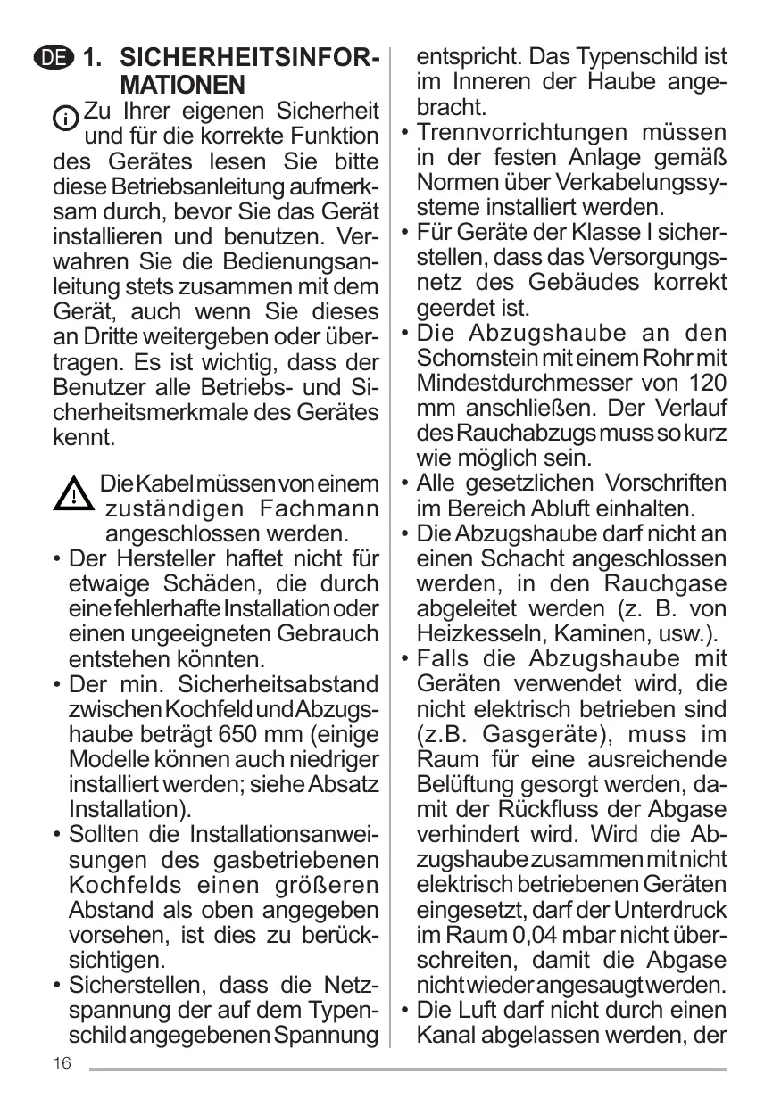 • Pour les appareils de Classe I, s’assurer que l’installation électrique de votre intérieur dispose d’une mise à la terre adéquate. • Reliez l’aspirateur du conduit de cheminée avec un tube ayant un diamètre minimum de 120 mm. Le parcours des fumées doit être le plus court possible. • Respecter toutes les normes concernant l’évacuation de l’air. • Ne reliez pas la hotte aspirante aux conduits de cheminée qui acheminent les fumées de combustion (par ex. de chaudières, de cheminées, etc.). • Si vous utilisez l’aspirateur en même temps que des appareils non électriques (par ex. fonctionnant au gaz), veillez à ce que la pièce soit adéquatement ventilée, afin d’empêcher le retour du flux des gaz d’évacuation. Si vous utilisez la hotte de cuisine en même temps que des appareils non alimentés à l’électricité, la pression négative dans la pièce ne doit pas dépasser 0,04 mbar, afin d’éviter que les fumées soient réaspirées dans la pièce où se trouve la hotte. • Ne pas évacuer l’air à travers une conduite utilisée pour l’évacuation des fumées des appareils de combustion alimentés au gaz ou avec d’autres combustibles.