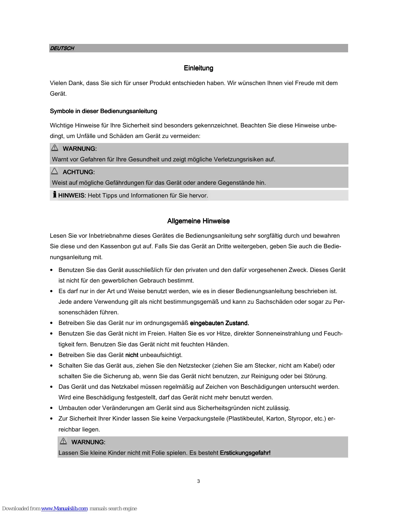 Downloaded from www.Manualslib.com manuals search engine DEUTSCH Einleitung Vielen Dank, dass Sie sich für unser Produkt entschieden haben. Wir wünschen Ihnen viel Freude mit dem Gerät. Symbole in dieser Bedienungsanleitung Wichtige Hinweise für Ihre Sicherheit sind besonders gekennzeichnet. Beachten Sie diese Hinweise unbeunb dingt, um Unfälle und Schäden am Gerät zu vermeiden: WARNUNG: Warnt vor Gefahren für Ihre Gesundheit und zeigt mögliche Verletzungsrisiken auf. ACHTUNG: ACHTUNG: Weist auf mögliche Gefährdungen für das Gerät oder andere Gegenstände hin. HINWEIS: HINWEIS: Hebt Tipps und Informationen für Sie hervor. Allgemeine Hinweise Lesen Sie vor Inbetriebnahme dieses Gerätes die Bedienungsanleitung sehr sorgfältig durch und bewahren Sie diese und den Kassenbon gut auf. Falls Sie das Gerät an Dritte weitergeben, geben Sie auch die BedieBedi nungsanleitung mit.