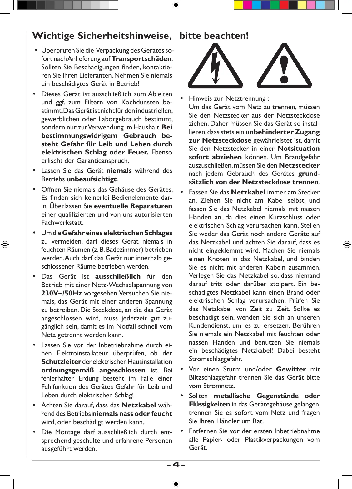 - Dieses Gerät ist ausschließlich zum Ableiten und ggf. zum Filtern von Kochdünsten bestimmt. Das Gerätist nicht für den industriellen, gewerblichen oder Laborgebrauch bestimmt, sondern nur zur Verwendung im Haushalt. Bei bestimmungswidrigem Gebrauch besteht Gefahr für Leib und Leben durch elektrischen Schlag oder Feuer. Ebenso erlischt der Garantieanspruch.