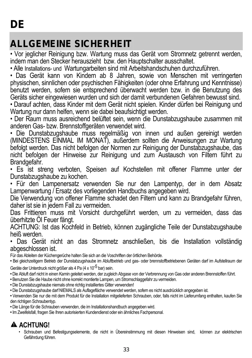 • Les enfants ne doivent pas jouer avec l’appareil. • Le nettoyage et l’entretien par l’usager ne doivent pas être effectués par des enfants sans surveillance. • La pièce doit avoir une aération suffisante lorsque la hotte est utilisée conjointement avec d'autres appareils fonctionnant au gaz ou autres combustibles. • La hotte doit être régulièrement nettoyée à la fois à l'intérieur et à l'extérieur (AU MOINS UNE FOIS PAR MOIS); cela devrait se faire en conformité avec les instructions d'entretien. Le non respect des instructions expressément fournies concernant le nettoyage de la hotte et des filtres peut provoquer des risques d'incendie. • Ne pas flamber d’aliments sous la hotte. • Pour le remplacement de la lampe, utilisez uniquement le type de lampe spécifié dans la section remplacement/maintenance lampe dans ce manuel. L'utilisation d'une flamme nue est dommageable pour les filtres et peut causer un incendie, par conséquent, il est déconseillé de l'utiliser. La friture doit être faite avec soin afin de s’assurer que l’huile surchauffée ne prenne pas feu. AVERTISSEMENT: Lorsque la table de cuisson est en fonctionnement, les parties accessibles de la hotte peuvent devenir très chaudes. • Ne pas brancher l'appareil au réseau électrique avant que l'installation ne soit complètement terminée.