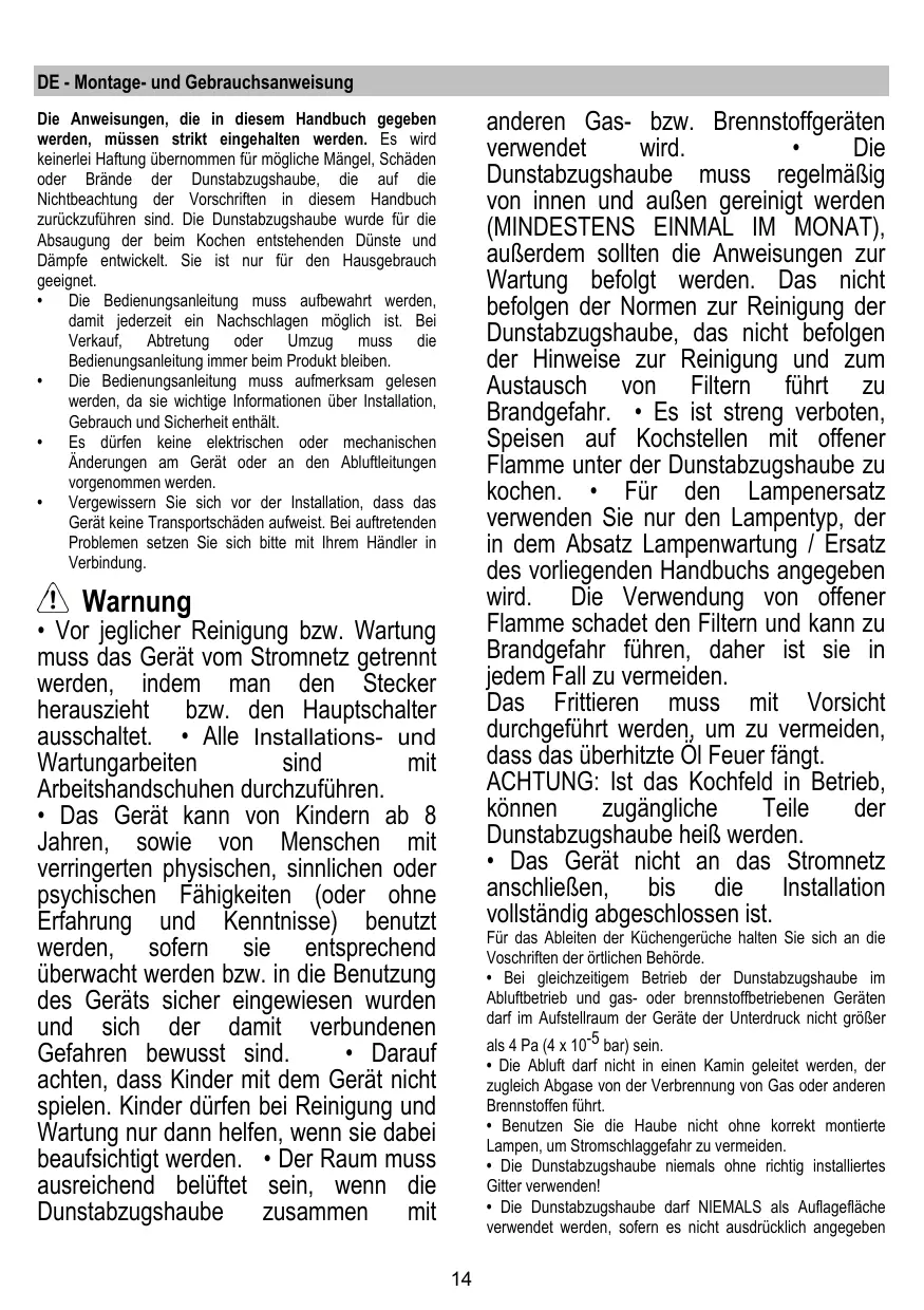 Das Gerät kann von Kindern ab 8 Jahren, sowie von Menschen mit verringerten physischen, Sinnlichen oder psychischen Fähigkeiten (oder ohne Erfahrung und Kenntnisse) benutzt werden, sofern sie entsprechend überwacht werden bzw. in die Benutzung des Geräts safer eingewiesen wurden und sich der damit verbundenen Gefahren bewusst sind. Darauf achten, dass Kinder mit dem Gerät nicht playen. Kinder dürfen bei Reinigung und Wartung nur dann halten, wenn sie bereits beaufsichtigt werden. Der Raum muss ausreichend beluftet sein, wenn die Dunstabzugshaube zusammen mit