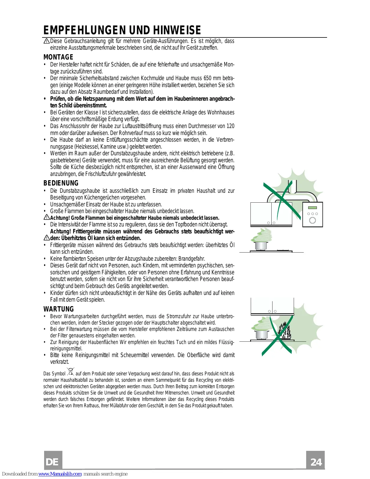• La hotte a été conçue exclusivement pour l’usage domestique, dans le but d’éliminer les odeurs de la cuisine. • Ne jamais utiliser abusivement la hotte. • Ne pas laisser les flammes libres à forte intensité quand la hotte est en service. • Toujours régler les flammes de manière à éviter toute sortie latérale de ces dernières par rapport au fond des marmites. • Contrôler les friteuses lors de l’utilisation car l’huile surchauffée pourrait s’enflammer. • Ne pas préparer d’aliments flambés sous la hotte de cuisine : risque d’incendie • Cet appareil ne doit pas être utilisé par des personnes (y compris les enfants) ayant des capacités psychiques, sensorielles ou mentales réduites, ni par des personnes n’ayant pas l’expérience et la connaissance de ce type d’appareils, à moins d'être sous le contrôle et la formation de personnes responsables de leur sécurité. • Les enfants doivent être surveillés pour s'assurer qu'ils ne jouent pas avec l'appareil.