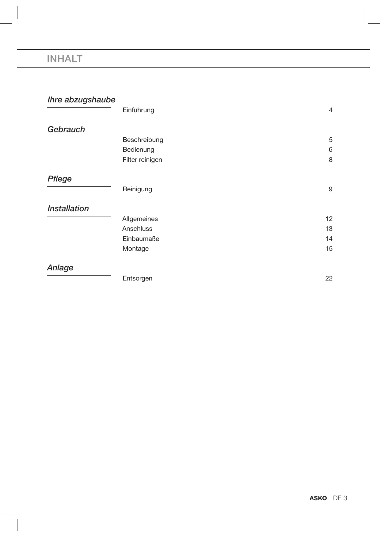 - FCKW-freies Polystyrol (PS-Hartschaum). Entsorgen Sie das Verpackungsmaterial auf verantwortliche und vorschriftsmäßige Weise. Um darauf hinzuweisen, dass elektrische Haushaltsgeräte vorschriftsgemäß getrennt entsorgt werden müssen, trägt das Produkt das Symbol eines durchgestrichenen Mülleimers. Das bedeutet, dass das Gerät am Ende seiner Lebensdauer nicht mit dem herkömmlichen Hausmüll entsorgt werden darf. Das Gerät muss bei einem städtischen Betrieb für getrennte Abfallentsorgung oder bei einer Verkaufsstelle abgeliefert werden, die die Entsorgung als Dienstleistung anbietet. Die getrennte Entsorgung von Haushaltsgeräten verhindert eventuelle negative Auswirkungen für Umwelt und Gesundheit, die durch unsachgemäße Entsorgung entstehen. Auf diese Weise wird sichergestellt, dass die Materialien, aus denen das Gerät besteht, wiederverwertet werden können und somit Energie und Rohstoffe gespart werden. DE 22 INDHOLD Din emhætte Indledning