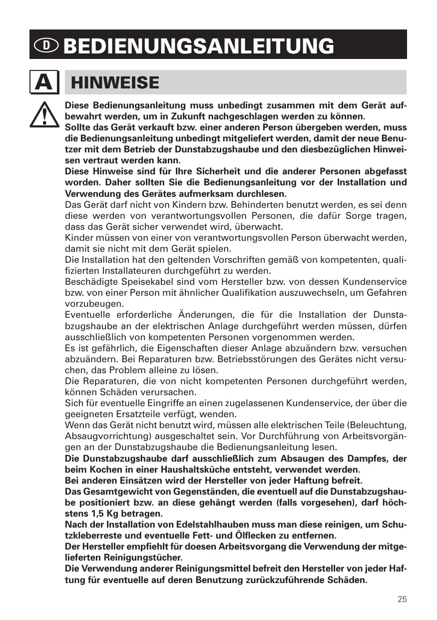 15 jours au moins afin d’éviter que les substances huileuses ou les graisses ne nuisent aux surfaces en acier. Nettoyer la hotte avec un chiffon humide et un peu de détergent liquide neutre ou avec de l’alcool dénaturé. Ne nettoyer qu’avec un chiffon souple trempé dans de l’eau contenant du savon neutre si la surface a subi un traitement anti-empreinte (Fasteel), en ayant soin de rincer et d’essuyer soigneusement. Ne pas utiliser de produits contenant des substances abrasives, un chiffon rêche ni le type de chiffon pour nettoyer l’acier que l’on trouve généralement dans le commerce car cela abîmerait irrémédiablement le traitement superficiel de l’inox. La surface définitivement abîmée de l’inox sera la conséquence directe du non-respect de ces indications. La notice complète doit être conservée avec l’appareil. Le fabricant décline toute responsabilité si ces indications ne sont pas respectées.