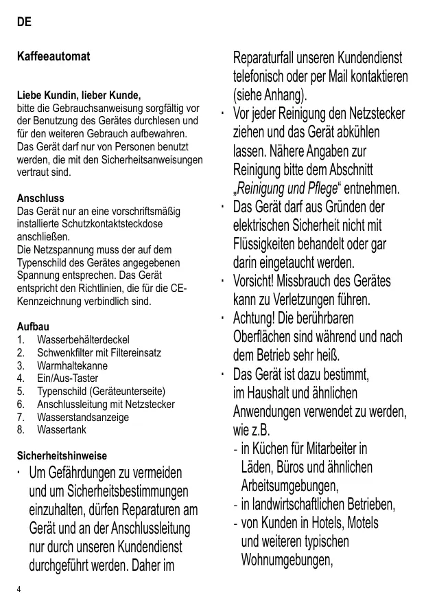 Kaffeezubereitung ∙ Wasser einfüllen: Wasserbehälterdeckel öffnen, gewünschte Menge kaltes Wasser einfüllen und Wasserbehälterdeckel schließen. ∙ Papierfilter einlegen: Schwenkfilter aufschwenken und den Filtereinsatz einsetzen. Der Filtereinsatz muss so eingesetzt werden, dass er durch Herunterklappen des Bügels arretiert wird. Einen Papierfilter Größe 4 in den Filtereinsatz einlegen. Vorher die perforierten Seiten umknicken. ∙ Kaffeemehl einfüllen: Wir empfehlen für jede normalgroße Tasse (125 ml) ca. 6 g = 1½ - 2 Teelöffel mittelfein bis fein gemahlenes Kaffeemehl zu verwenden. ∙ Kanne vorbereiten: Den Durchbrühdeckel auf die Kanne setzen, im Uhrzeigersinn verriegeln und die Kanne in das Gerät stellen. Durch den Deckel wird der Tropfverschluss im Schwenkfilter während des Brühvorganges geöffnet. ∙ Brühvorgang starten: Netzstecker einstecken und den Kaffeeautomaten durch kurzen Druck auf den Ein-/Aus-Taster einschalten. Falls die Aromafunktion gewünscht ist, den Ein-/ Aus-Taster für ca. 2 Sekunden drücken, bis die Kontrollleuchte zu blinken beginnt. Der Wasserdurchlauf startet. ∙ Kaffee entnehmen: Wasserdurchlauf durch den Filter abwarten und die Kanne entnehmen. ∙ Kaffeeautomaten ausschalten: Nach dem Brühvorgang das Gerät ausschalten und den Netzstecker ziehen. Durchbrühdeckel Der Durchbrühdeckel kann während des Brühvorgangs und zum Ausgießen auf der Warmhaltekanne bleiben und muss nicht abgenommen werden. Zum Ausgießen den Deckelöffner betätigen. Warmhaltekanne ∙ Der Verschluss ist technisch bedingt nicht hermetisch dicht. Daher die Warmhaltekanne im gefüllten Zustand nur senkrecht halten. ∙ Warmhaltung: Eine Warmhaltekanne ist ein Energiespeicher. Deshalb ist es wichtig, die Warmhaltekanne immer voll zu füllen. Bei einer Teilfüllung oder Aufbewahrung einer Restmenge, ergibt sich eine wesentlich verkürzte Warmhaltung. Wenn die Warmhaltekanne vor dem Gebrauch mit heißem Wasser ausgespült wird, bleibt der Kaffee länger heiß. ∙ Um Verbrühungen zu vermeiden die Warmhaltekanne nicht unbeaufsichtigt in der Nähe von Kindern stehen lassen. ∙ Daher auch niemals direkt aus der Warmhaltekanne trinken und nicht hineingreifen. ∙ Die Kanne immer mit dem Deckel verschließen. Der Kaffee kann ohne Deckelentnahme ausgeschenkt werden. Zum Ausgießen den Deckelöffner betätigen. ∙ Die Warmhaltekanne darf nicht in der Spülmaschine gespült und nicht in Mikrowellengeräten benutzt werden. Entkalken ∙ Alle Heißwassergeräte müssen je nach Kalkgehalt des Wassers und Benutzungshäufigkeit entkalkt werden, damit das einwandfreie Funktionieren des Gerätes nicht beeinträchtigt wird. ∙ Der Garantieanspruch erlischt bei Geräten, die aufgrund mangelnder