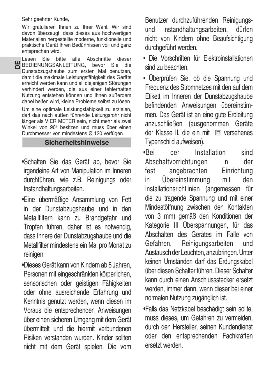 •Votre hotte est destinée à un usage domestique et uniquement pour l’extraction et la purification des gaz en provenance de la préparation d’aliments. Une utilisation différente pourrait être dangereuse et vous en serez totalement responsable.