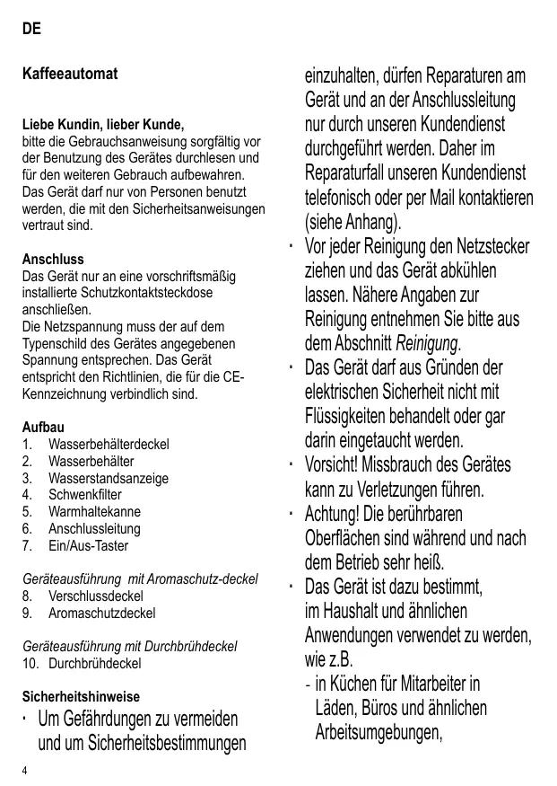Schwenkfilter aufschwenken und einen Papierfilter Größe 4 einlegen. Vorher die perforierten Seiten umknicken. ∙ Kaffeemehl einfüllen: Wir empfehlen für jede normalgroße Tasse (125ml) ca. 6g = 1½ - 2 Teelöffel mittelfein bis fein gemahlenes Kaffeemehl zu verwenden. Anschließend Wasserbehälterdeckel schließen. ∙ Kanne vorbereiten: Kanne mit dem Aromaschutzdeckel verschließen und in das Gerät stellen. Durch den Deckel wird der Tropfverschluss im Schwenkfilter während des Brühvorganges geöffnet. ∙ Brühvorgang starten: Netzstecker einstecken und den Kaffeeautomaten mit dem Ein-/Aus-Taster einschalten. Der Wasserdurchlauf beginnt. ∙ Kaffee entnehmen: Wasserdurchlauf durch den Filter abwarten und die Kanne entnehmen. Zur längeren Warmhaltung des Kaffees den Aromaschutzdeckel abnehmen und die Kanne mit dem Verschlussdeckel verschließen Bei Geräten mit Durchbrühdeckel kann dieser auf der Warmhaltekanne bleiben. Nach dem Brühvorgang schaltet sich das Gerät automatisch ab. ∙ Netzstecker ziehen: Nach dem Brühvorgang den Netzstecker ziehen. ∙ Abbrechen des Brühvorgangs: Soll der Brühvorgang vorzeitig abgebrochen werden, kann das Gerät durch erneutes Drücken des Ein-/Aus-Tasters ausgeschaltet werden. Geräteausführung mit Durchbrühdeckel Der Durchbrühdeckel kann während des Brühvorgangs und zum Ausgießen auf der Warmhaltekanne bleiben und muss nicht abgeschraubt werden. Zum Ausgießen den Deckel ca. ½ Drehung nach links drehen, so dass der Pfeil auf dem Deckel auf Höhe des Ausgießers steht. Warmhaltekanne ∙ Der Verschluss ist technisch bedingt nicht hermetisch dicht, damit dieser sich nicht festsaugen kann. Daher die Warmhaltekanne im gefüllten Zustand nur senkrecht halten. ∙ Warmhaltung: Eine Warmhaltekanne ist ein Energiespeicher. Deshalb ist es wichtig, die Warmhaltekanne immer voll zu füllen. Bei einer Teilfüllung oder Aufbewahrung einer Restmenge, ergibt sich eine wesentlich verkürzte Warmhaltung. Wenn Sie die Warmhaltekanne vor dem Gebrauch mit heißem Wasser ausspülen, bleibt der Kaffee länger heiß. Der Einsatz der Warmhaltekanne besteht aus hochwertigem doppelwandigem Glas. Schlieren bzw. Blasen, die auch wie Sprünge oder Risse aussehen können, haben keinen Einfluss auf die Gebrauchsfähigkeit und Warmhaltung der Warmhaltekanne. Zur optimalen Isolierung befindet sich zwischen den Glaswänden ein Vakuum. Wenn das Glas durch einen der nachfolgend aufgeführten Gründe beschädigt wird, besteht die Gefahr dass der Einsatz aufgrund des Vakuums implodiert. Dies kann auch zu einem späteren Zeitpunkt geschehen, ohne dass noch ein Zusammenhang zur eigentlichen Schadensursache gesehen wird. ∙ Trinken Sie daher niemals direkt aus der Warmhaltekanne und greifen Sie nicht hinein. Verschließen Sie die Kanne immer mit dem Deckel. Der Kaffee kann ohne Deckelentnahme ausgeschenkt werden. Zum Ausgießen den Drehverschluss ca. ½ Drehung nach links drehen. Lassen Sie die Warmhaltekanne nicht unbeaufsichtigt in der Nähe von Kindern stehen. Damit das Glas nicht zerspringt: ∙ Vermeiden Sie Erschütterungen, Stöße und krasse Temperaturunterschiede. ∙ Nicht mit einem harten Gegenstand, z. B. Teelöffel, umrühren. ∙ Keine harten Bürsten oder schmirgelartige Reiniger verwenden. ∙ Nicht mit einem Lappen auswischen. Im Lappen enthaltene Schmutzpartikel können das Glas anritzen (ähnlich wie mit einem Glasschneider). ∙ Nicht in der Spülmaschine spülen. ∙ Nicht in Mikrowellengeräten benutzen. Entkalken ∙ Alle Heißwassergeräte müssen je nach Kalkgehalt des Wassers und Benutzungshäufigkeit entkalkt werden, damit das einwandfreie Funktionieren des Gerätes nicht beeinträchtigt wird. ∙ Der Garantieanspruch erlischt bei Geräten, die aufgrund mangelnder Entkalkung nicht einwandfrei funktionieren. ∙ Wenn sich die Brühzeit verlängert oder eine vermehrte Geräuschbildung beobachtet wird, ist dies ein sicheres Anzeichen dafür, dass der Kaffeeautomat entkalkt werden muss. ∙ Ist die Verkalkung des Kaffeeautomaten