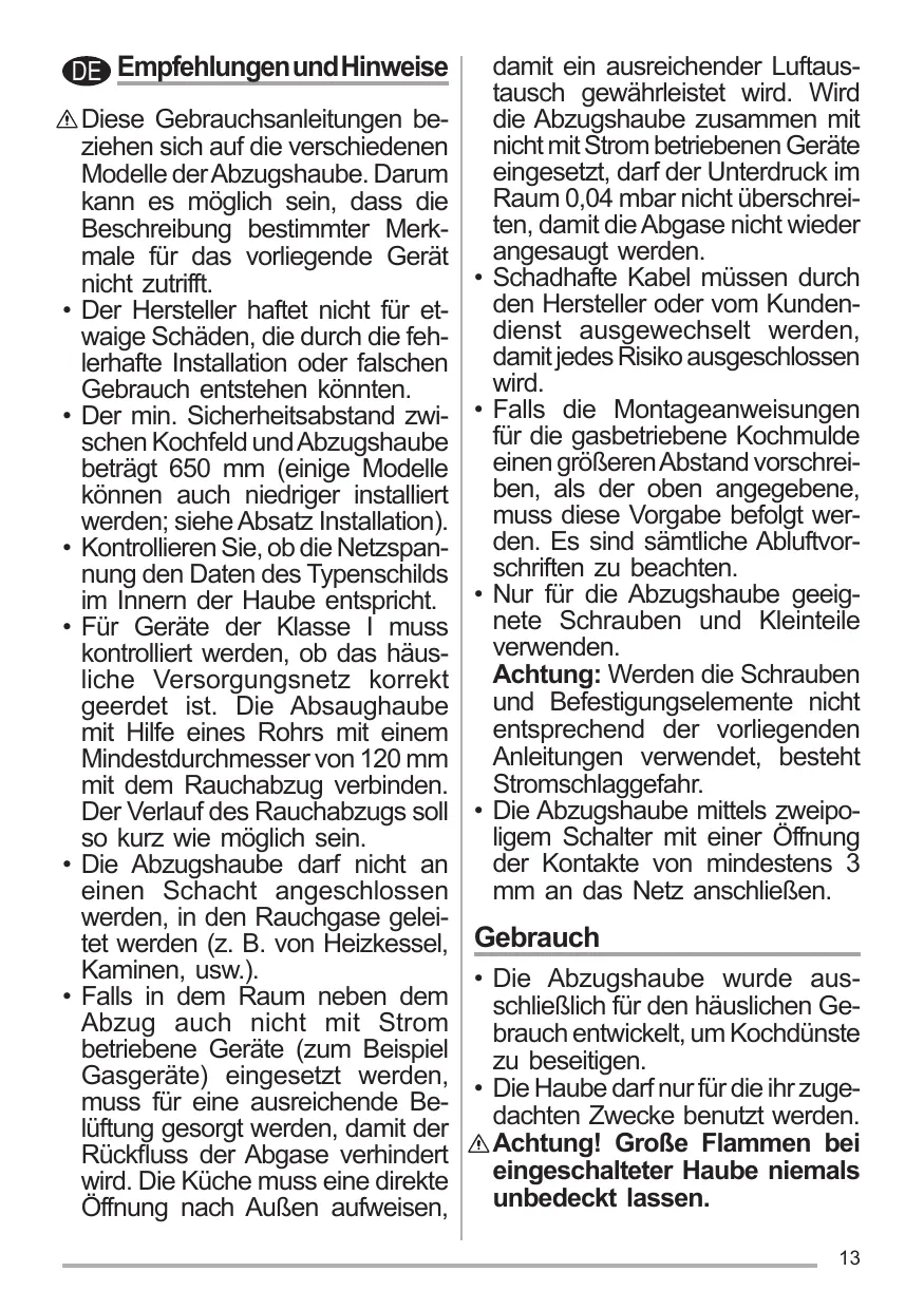 Si le cordon d’alimentation est endommagé, veuillez le faire remplacer par le fabricant ou par un service après-vente agréé pour éviter tout risque d’accident. Si les instructions d’installation du plan de cuisson à gaz spécifient une distance supérieure à celle indiquée ci-dessus, veuillez impérativement en tenir compte. Toutes les normes concernant l’évacuation de l’air doivent être respectées. Utiliser exclusivement des vis et des petites pièces du type adapté pour la hotte. Attention: toute installation des vis et des dispositifs de fixation non conforme aux présentes instructions peut entraîner des risques de décharges électriques. Brancher la hotte à l’alimentation de secteur avec un interrupteur bipolaire ayant une ouverture des contacts d’au moins 3 mm. 9