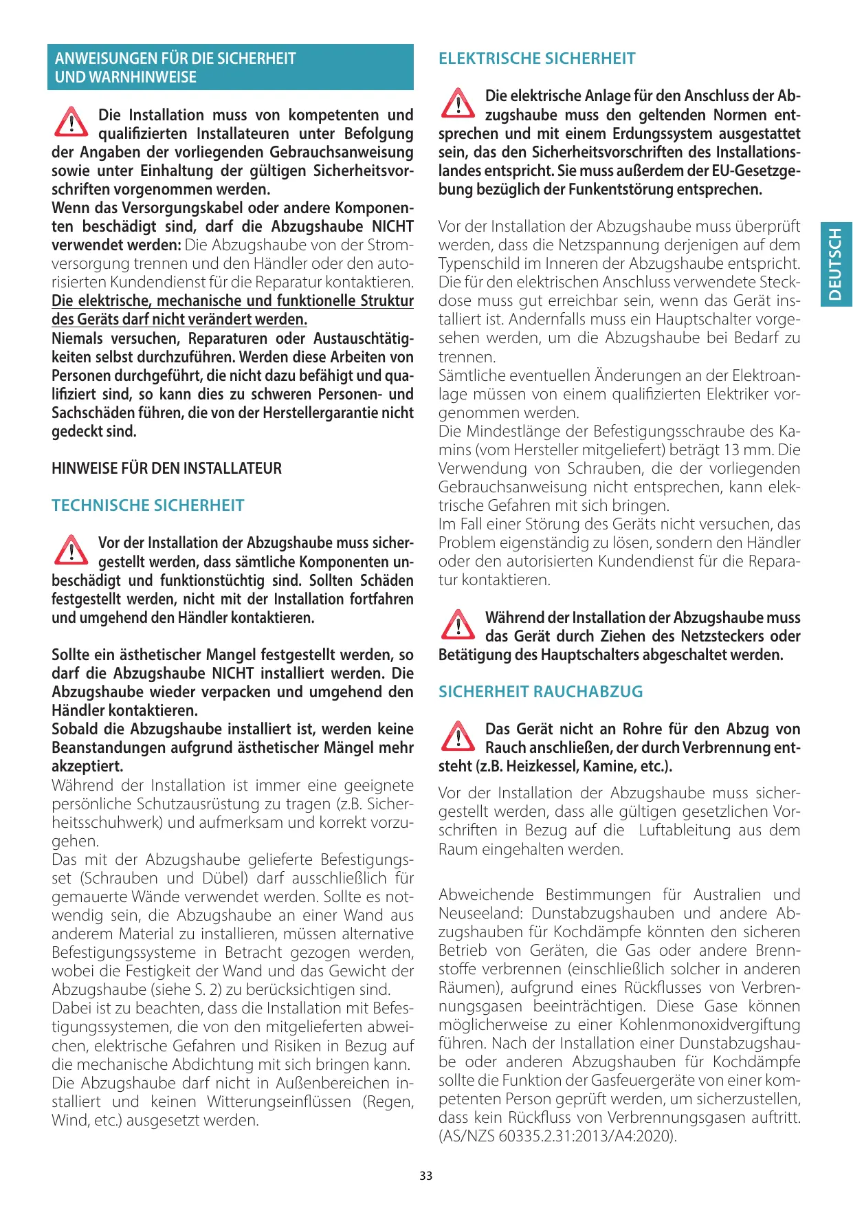 Déviation pour l’Australie et la Nouvelle Zélande: Les hottes de cuisine et les autres aspirateurs des fumées de cuisson peuvent nuire au bon fonctionnement des appareils qui brûlent du gaz ou d’autres combustibles
