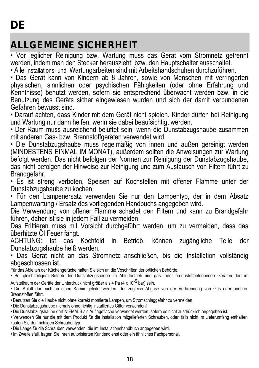 • Anders, contacteer onze Klantenservice (Het telefoonnummer staat in het garantieboekje). • Para la sustitución de la lámpara sólo utilizar el tipo de lámpara indicado en la sección de mantenimiento/sustitución de este manual. El uso de una llama libre es perjudicial para los filtros y puede provocar incendios, por lo tanto, debe evitarse en cualquier caso. Los fritos debe realizarse con cuidado para evitar que el aceite caliente prenda fuego. ATENCIÓN: Cuando la placa de cocción está funcionando las partes accesibles de la campana pueden calentarse. • No conectar la unidad a la red eléctrica hasta que la instalación sea totalmente completada. • En cuanto a las medidas técnicas y de seguridad a adoptar para la descarga de los humos, seguir estrictamente lo previsto por los reglamentos de las autoridades locales competentes. • El aire aspirado no debe ser transportado en un conducto usado para la descarga de humos producidos por dispositivos de combustión a gas u otros combustibles. • No utilizar ni dejar la campana sin las luces correctamente instaladas debido al posible riesgo de descarga eléctrica. • No utilizar nunca la campana sin la rejilla montada correctamente! • La campana NUNCA debe utilizarse como una superficie de apoyo a menos que así se indique específicamente. • Utilizar sólo los tornillos para fijación suministrados con el producto para su instalación, o, si no se suministran, comprar el tipo correcto de tornillos. Utilizar la longitud correcta para los tornillos que se identifican en la Guía de instalación. • En caso de duda, consultar el centro de asistencia autorizado o un similar personal calificado.