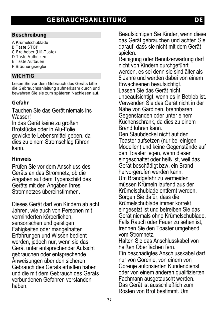 Ein beschädigtes Anschlusskabelarf nur von Gorenje,von einem von Gorenje autorisierten Kundendienst oder von einem anderen qualifizierten Fachmann ausgetauscht werden. Das Gerät ist ausschließlich zum Rosten von Brot bestimmt. Um