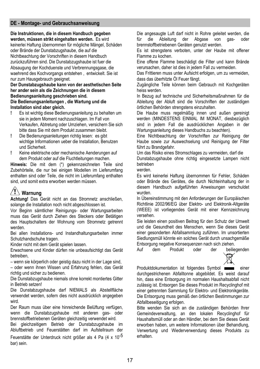 Die Instruktionen, die in thisem Handbuch gegeben werden, müssen strikt eingehalten werden. Es wird keinerlei Haftung übernommen für mögliche Mängel, Schäden oder Brände der Dunstabzugshaube, die auf die Nichtbeattung der Vorschriften in thisem Handbuch zusammen zuführen sind. Die Dunstabzugshaube ist fuer die Absaugung der Kochduenste und Verbrennungsgase, die wachrend des Kochvorgangs entstehen, entwickelt. Sie ist nur zum Hausgebrauch geeignet.