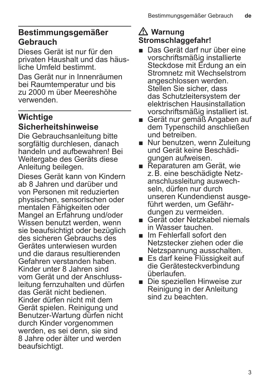 électrique de votre maison est Veuillez lire la notice dʼutilisaconforme. tion attentivement, respecter ■ Branchez et utilisez lʼappareil les instructions et la conserver uniquement en conformité soigneusement ! Si lʼappaavec les indications figurant reil change de propriétaire, sur la plaque signalétique. remettez-lui cette notice. ■ Nʼutilisez lʼappareil que si son cordon dʼalimentation Les enfants de 8 ans et plus, et lʼappareil lui-même ne les personnes souffrant dʼun présentent aucun dommage. handicap physique, sensoriel ■ Afin dʼécarter tout danger, ou mental ou ne détenant pas seul notre service aprèslʼexpérience et/ou les connaisvente est habilité à réparer sances nécessaires pourront lʼappareil, comme par utiliser cet appareil à condition exemple procéder au de le faire sous surveillance, remplacement dʼun cordon ou que son utilisation sûre leur dʼalimentation endommagé. ait été enseignée et quʼils aient ■ Ne plongez jamais lʼappareil compris les dangers qui en ou le cordon dʼalimentation émanent. Maintenir les enfants dans lʼeau. de moins de 8 ans à lʼécart de lʼappareil et du cordon dʼalimen- ■ En cas de défaut, débranchez immédiatement la fiche tation secteur et ne pas leur secteur ou coupez la tension permettre dʼutiliser lʼappareil. du réseau. Ne pas laisser les enfants jouer ■ Empêchez que du liquide ne avec lʼappareil. Le nettoyage et se renverse sur le connecteur. lʼentretien incombant à lʼutilisa■ Les instructions de nettoyage teur ne doivent pas être effecspéciales figurant dans les tués par des enfants sauf sʼils notices sont à respecter. sont âgés de 8 ans et plus et sʼils agissent sous surveillance. 55