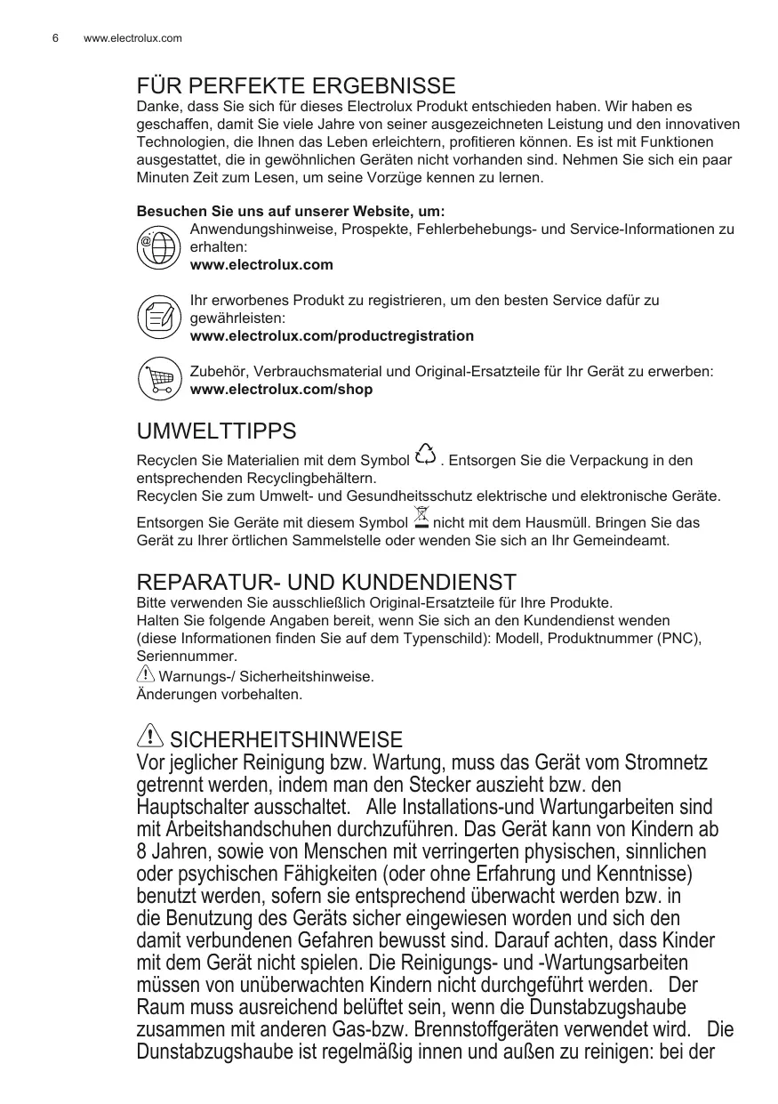 Avant toute opération de nettoyage ou d’entretien, débranchez l’alimentation électrique en retirant la fiche ou en coupant l’interrupteur général. Utilisez de gants de travail pour toute opération de nettoyage ou d’entretien. L’appareil peut être utilisé par les enfants âgés pas moins de 8 ans et les personnes ayant des capacités réduites physiques, sensorielles ou mentales, ou sans l’expérience ou les connaissances nécessaires, uniquement sous surveillance ou après ils ont reçu des instructions relatives à l’utilisation en sécurité de l’appareil et ont compris les dangers inhérents. Les enfants doivent être surveillés pour s’assurer qu’ils ne jouent pas avec l’appareil. Le nettoyage et l’entretien ne doivent pas être effectués par des enfants sans surveillance. La pièce doit avoir une aération suffisante lorsque la hotte est utilisée conjointement avec d’autres appareils fonctionnant au gaz ou autres combustibles. La hotte doit être régulièrement nettoyée à la fois à l’intérieur et à l’extérieur (AU MOINS UNE FOIS PAR MOIS); cela devrait se faire en conformité avec les instructions d’entretien dans ce manuel. Le non