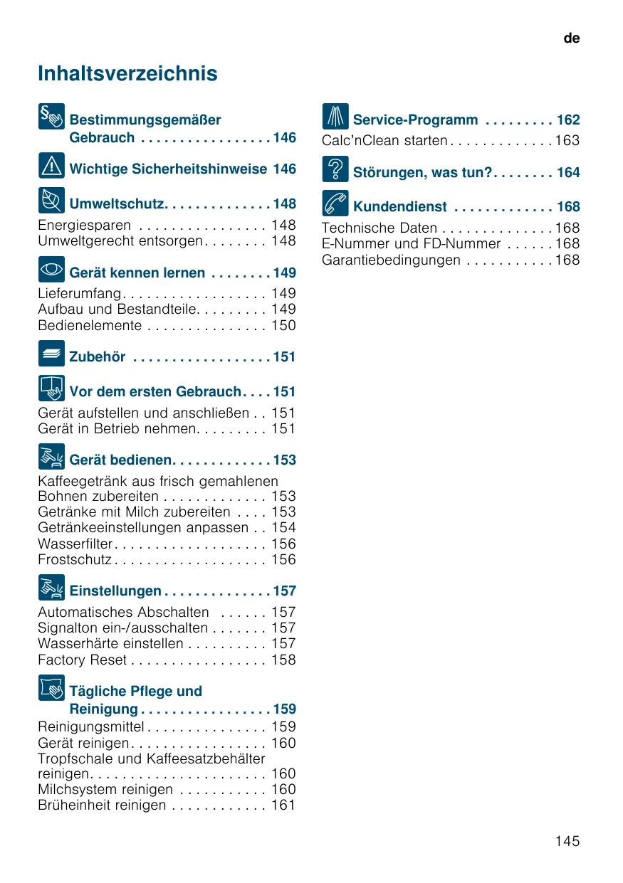 Reinigung . . . . . . . . . . . . . . . . . 159 Reinigungsmittel . . . . . . . . . . . . . . . 159 Gerät reinigen . . . . . . . . . . . . . . . . . 160 Tropfschale und Kaffeesatzbehälter reinigen. . . . . . . . . . . . . . . . . . . . . . 160 Milchsystem reinigen . . . . . . . . . . . 160 Brüheinheit reinigen . . . . . . . . . . . . 161 145