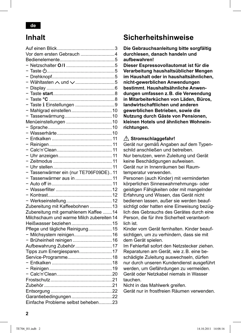 Auf.einen.Blick3. Vor.dem.ersten.Gebrauch4 Bedienelemente5 −.Netzschalter.O / I5 −.Taste.a5 −.Drehknopf5 −.Wähltasten.<.und.>5 −.Display6 −.Taste.start8 −.Taste.°C8 −.Taste.j.Einstellungen9 −.Mahlgrad.einstellen10 −.Tassenwärmung10 Menüeinstellungen10 −.Sprache10 −.Wasserhärte10 −.Entkalken 11 −.Reinigen 11 −.Calc‘n‘Clean 11 −.Uhr.anzeigen 11 −.Zeitmodus 11 −.Uhr.stellen 11 −.Tassenwärmer.ein.(nur.TE706F09DE)... 11 −.Tassenwärmer.aus.in 11 −.Auto.off.in 11 −.Wasserilter12 −.Kontrast12 −.Werkseinstellung12 Zubereitung.mit.Kaffeebohnen13 Zubereitung.mit..gemahlenem.Kaffee14 Milchschaum.und.warme.Milch.zubereiten.14 Heißwasser.beziehen15 Plege.und.tägliche.Reinigung15 −.Milchsystem.reinigen16 −.Brüheinheit.reinigen16 Aufbewahrung.Zubehör17 Tipps.zum.Energiesparen17 ServiceProgramme18 −.Entkalken18 −.Reinigen19 −.Calc‘n‘Clean20 Frostschutz21 Zubehör21 Entsorgung22 Garantiebedingungen22 Einfache.Probleme.selbst.beheben23