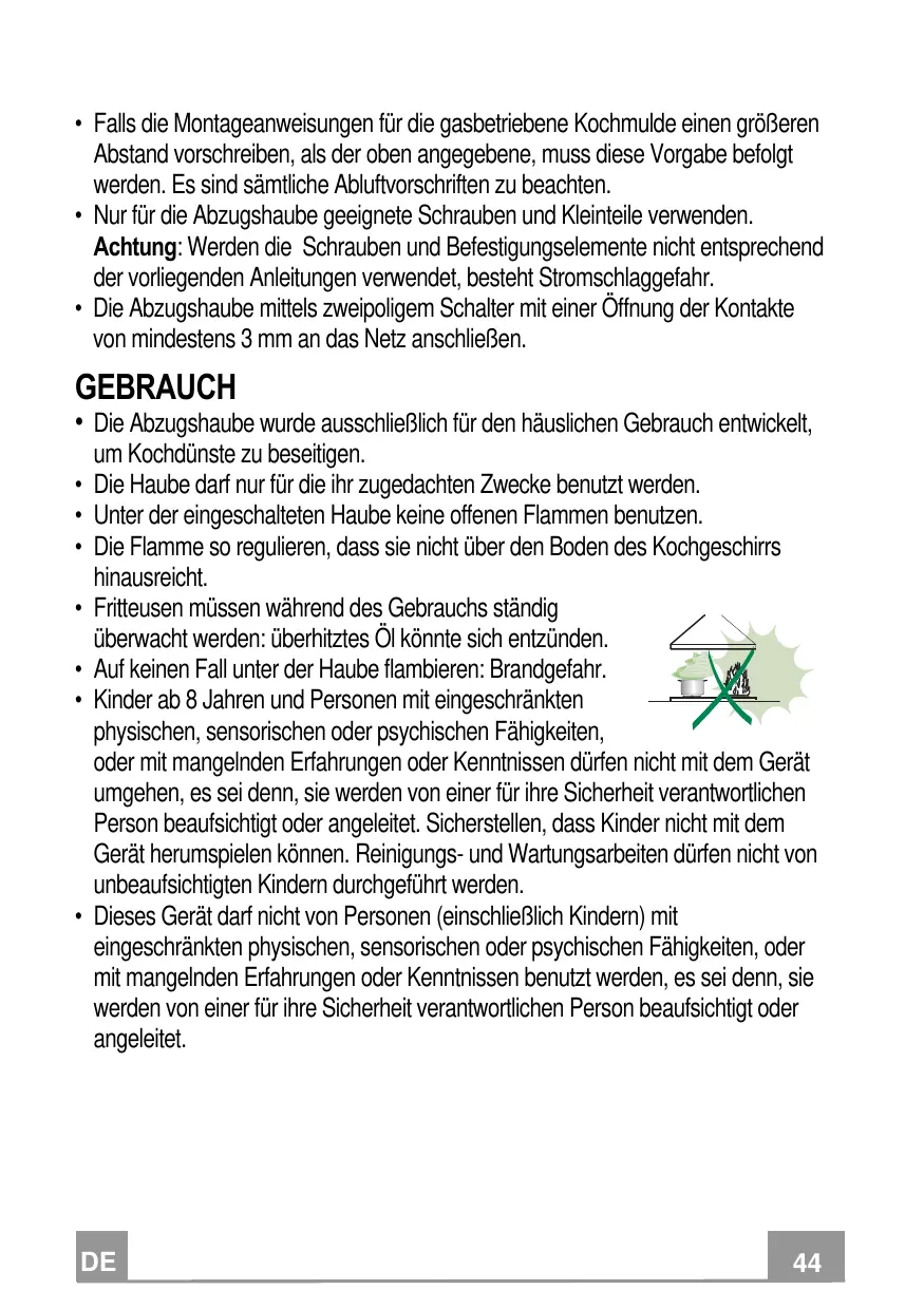 • Cette hotte aspirante a été conçue exclusivement pour un usage domestique, dans le but d’éliminer les odeurs de cuisine. • Ne jamais utiliser la hotte pour des objectifs différents de ceux pour lesquels elle a été conçue. • Ne jamais laisser un feu vif allumé sous la hotte lorsque celle-ci est en fonction. • Régler l’intensité du feu de manière à l’orienter exclusivement vers le fond de la casserole, en vous assurant qu’il ne déborde pas sur les côtés. • Contrôler constamment les friteuses durant leur utilisation : l’huile surchauffée risque de s’incendier. • Ne pas flamber des mets sous la hotte : sous risque de provoquer un incendie. • Cet appareil n’est pas destiné à être utilisé par des enfants d’un âge inférieur à 8 ans, ni par des personnes dont les capacités physiques, sensorielles ou mentales sont diminuées ou qui ont une expérience et des connaissances insuffisantes, à moins que ces enfants ou ces personnes ne soient attentivement surveillés et instruits sur la manière d’utiliser cet appareil en sécurité et sur les dangers que cela comporte. Assurez-vous que les enfants ne jouent pas avec cet appareil. Le nettoyage et l’entretien de la part de l’utilisateur ne doivent pas être effectués par des enfants, à moins que ce ne soit sous la surveillance d’une personne responsable. • Cet appareil n’est pas destiné à être utilisé par des personnes (enfants compris) dont les capacités physiques, sensorielles ou mentales sont diminuées ou ayant une expérience et des connaissances insuffisantes, à moins que ces personnes ne soient attentivement surveillées et instruites par un responsable de leur sécurité.