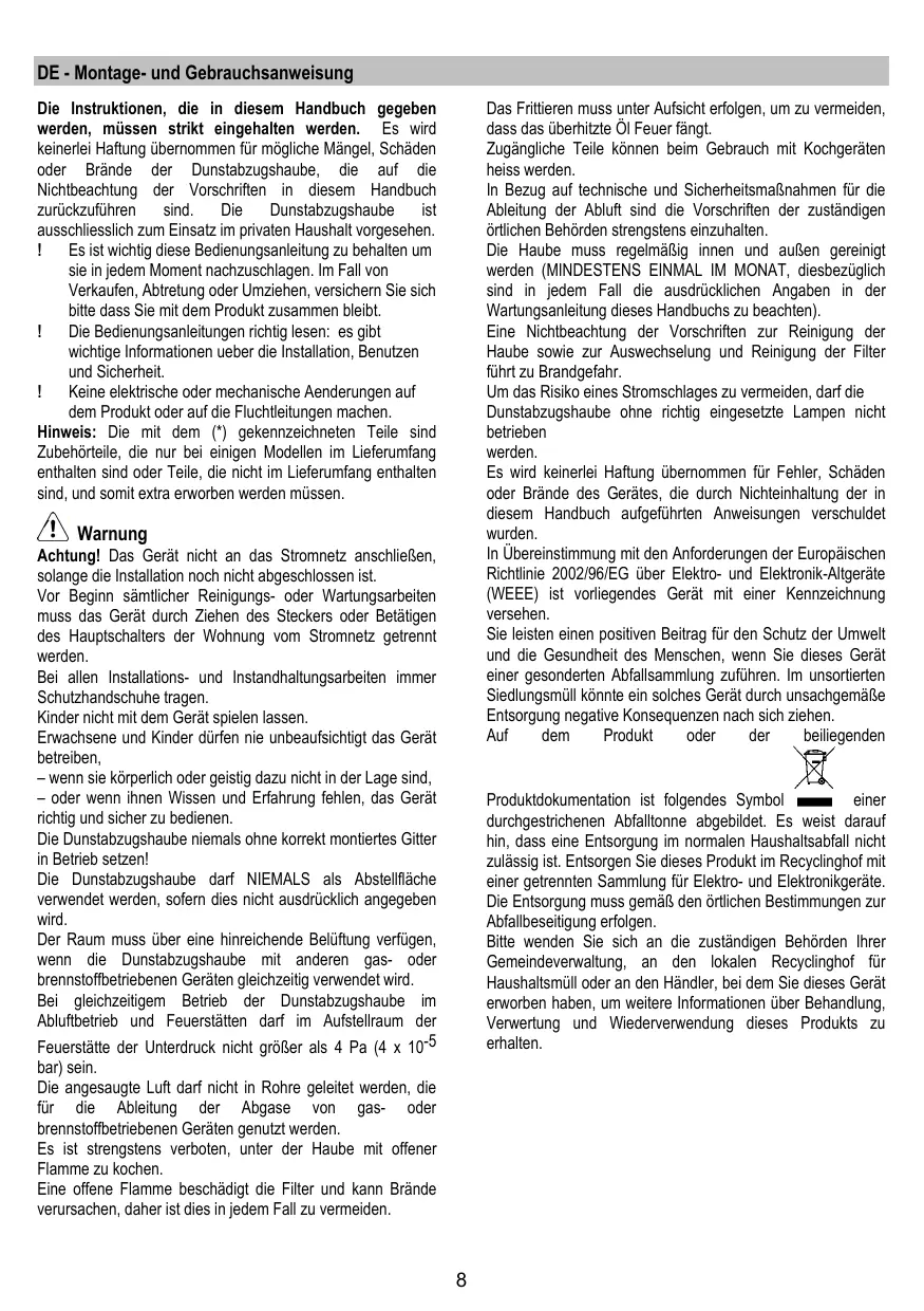 Attention! Ne pas raccorder l’appareil au circuit électrique avant que le montage ne soit complètement terminé. Avant toute opération de nettoyage ou d’entretien, débrancher la hotte du circuit électrique en retirant la prise ou en coupant l’interrupteur général de l’habitation. Munissez-vous de gants de travail avant d’effectuer toute opération d’installation et d’entretien. L’appareil n’est pas destiné à une utilisation par des enfants ou des personnes à capacités physiques, sensorielles ou mentales réduites et sans expérience et connaissance à moins qu’ils ne soient sous la supervision ou formés sur l’utilisation de l’appareil par une personne responsable de leur sécurité. Les enfants doivent être surveillés afin qu’ils ne jouent pas avec l’appareil. Ne jamais utiliser la hotte sans que la grille ne soit montée correctement! La hotte ne doit JAMAIS être utilisée comme plan pour déposer quelque chose sauf si cela est expressément indiqué. Quand la hotte est utilisée en même temps que d’autres appareils à combustion de gaz ou d’autres combustibles, le local doit disposer d’une ventilation suffisante. L’air aspiré ne doit jamais être envoyé dans un conduit utilisé pour l’évacuation des fumées produites par des appareils à combustion de gaz ou d’autres combustibles. Il est formellement interdit de faire flamber les aliments sous la hotte. L’utilisation de flammes libres peut entraîner des dégâts aux filtres et peut donner lieu à des incendies, il faut donc les éviter à tout prix. La friture d’aliments doit être réalisée sous contrôle pour éviter que l’huile surchauffée ne prenne feu. Les pièces accessibles peuvent se réchauffer de façon importante quand elles sont utilisées avec des appareils pour la cuisson.