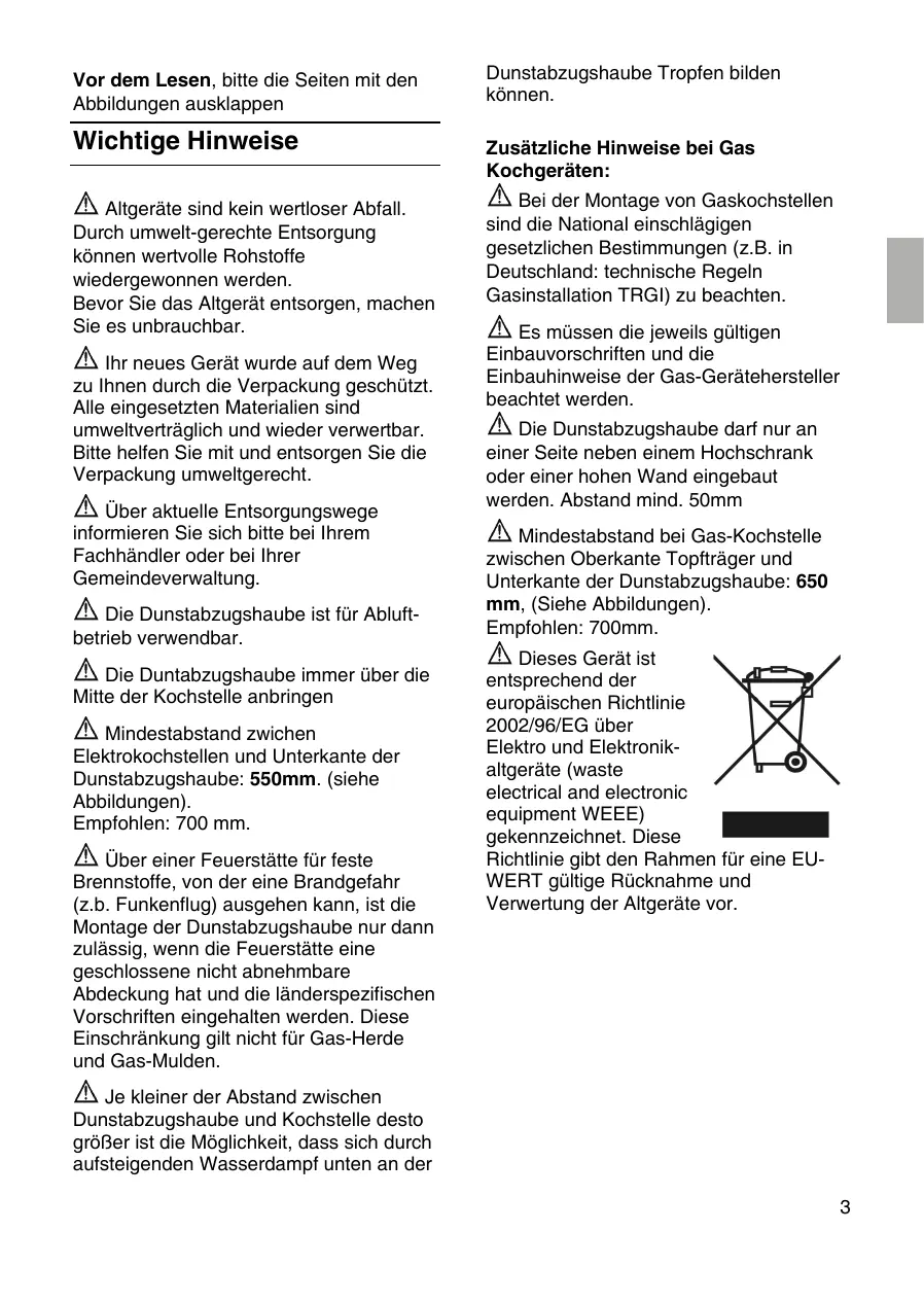 Remarques supplémentaires concernant le cuisinières à gaz: Lors du montage de foyers gaz, veuillez respecter les dispositions légales en vigueur dans votre pays (en Allemagne par example: les Règles techniques TRGI régissant l‘installation du gaz). Respectez les prescriptions et consignes d’encastrement en leur version applicable, publiées par les fabricants d’appareils au gaz. La hotte aspirante ne pourra cotoyer que sur un côté un meuble haut ou une paroi haute. Ecart minimum: 50 mm. Ecart minimum, en présence de foyers au gaz, entre le bord supérieur de la grille support et le bord inférieur de la hotte: 650 mm. (voir figures). Recommandation: 700 mm. Cet appareil est marqué selon la directive européenne 2002/96/CE relative aux appareils Plus l’ecart est faible entre la hotte aspirante et le foyer et plus il se pourra que la vapeur montant des casseroles se 23