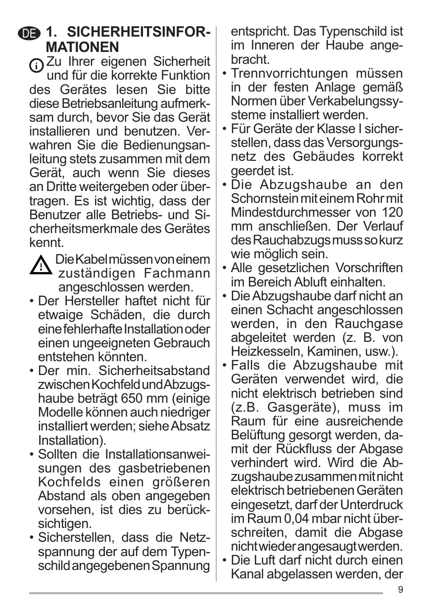à celle indiquée sur la plaque des caractéristiques apposée à l’intérieur de la hotte. Les dispositifs de sectionnement doivent être montés dans l’installation fixe conformément aux normes sur les systèmes de câblage. Pour les appareils de Classe I, s’assurer que l’installation électrique de votre intérieur dispose d’une mise à la terre adéquate. Reliez l’aspirateur du conduit de cheminée avec un tube ayant un diamètre minimum de 120 mm. Le parcours des fumées doit être le plus court possible. Respecter toutes les normes concernant l’évacuation de l’air. Ne reliez pas la hotte aspirante aux conduits de cheminée qui acheminent les fumées de combustion (par ex. de chaudières, de cheminées, etc.). Si vous utilisez l’aspirateur en même temps que des 3