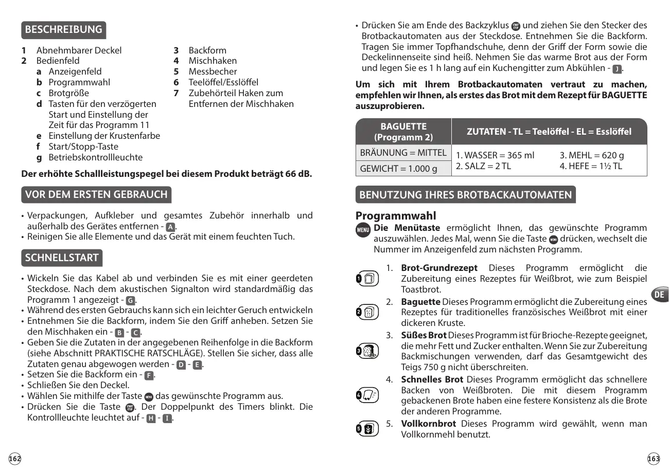 • Déroulez le cordon et branchez-le sur une prise électrique reliée à la terre. Après le signal sonore, le programme 1 s’affiche par défaut - G . • Une légère odeur peut se dégager lors de la première utilisation. • Retirez la cuve à pain en soulevant la poignée. Adaptez ensuite le mélangeur - B - C . • Ajoutez les ingrédients dans la cuve dans l’ordre préconisé (voir paragraphe CONSEILS PRATIQUES). Assurez-vous que tous les ingrédients soient pesés avec exactitude - D - E . • Introduisez la cuve à pain - F . • Fermez le couvercle. . • Sélectionnez le programme désiré à l’aide de la touche • Appuyez sur la touche . Les 2 points de la minuterie clignotent. Le temoin de fonctionnement s’allume - H - I . et débranchez la machine à pain. Retirez la cuve à • A la fin du cycle de cuisson, appuyez sur pain. Utilisez toujours des gants isolants car la poignée de la cuve est chaude ainsi que l’intérieur du couvercle. Démoulez le pain à chaud et placez-le 1 h sur une grille pour le refroidir - J .