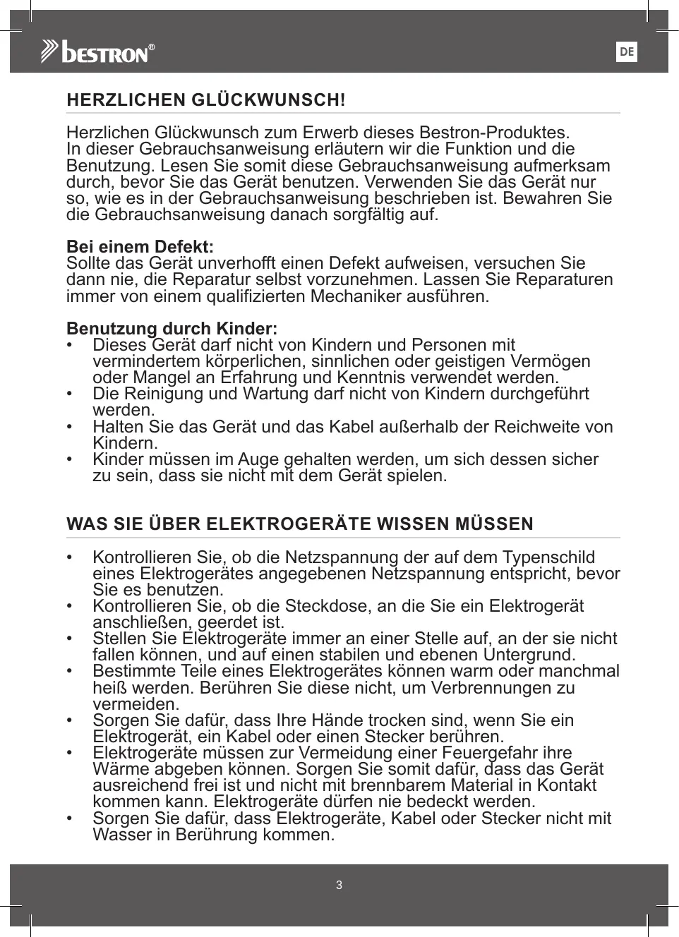 DE HERZLICHEN GLÜCKWUNSCH! Herzlichen Glückwunsch zum Erwerb dieses Bestron-Produktes. In dieser Gebrauchsanweisung erläutern wir die Funktion und die Benutzung. Lesen Sie somit diese Gebrauchsanweisung aufmerksam durch, bevor Sie das Gerät benutzen. Verwenden Sie das Gerät nur so, wie es in der Gebrauchsanweisung beschrieben ist. Bewahren Sie die Gebrauchsanweisung danach sorgfältig auf. Bei einem Defekt: Sollte das Gerät unverhofft einen Defekt aufweisen, versuchen Sie dann nie, die Reparatur selbst vorzunehmen. Lassen Sie Reparaturen immer von einem qualifizierten Mechaniker ausführen. Benutzung durch Kinder: • Dieses Gerät darf nicht von Kindern und Personen mit vermindertem körperlichen, sinnlichen oder geistigen Vermögen oder Mangel an Erfahrung und Kenntnis verwendet werden. • Die Reinigung und Wartung darf nicht von Kindern durchgeführt werden. • Halten Sie das Gerät und das Kabel außerhalb der Reichweite von Kindern. • Kinder müssen im Auge gehalten werden, um sich dessen sicher zu sein, dass sie nicht mit dem Gerät spielen. WAS SIE ÜBER ELEKTROGERÄTE WISSEN MÜSSEN • • • • • • •