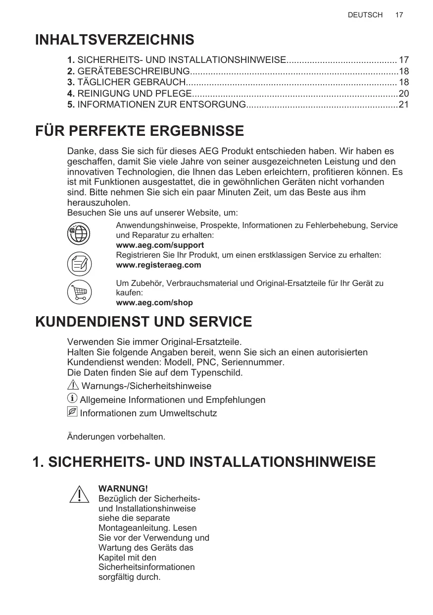 Danke, dass Sie sich für dieses AEG Produkt entschieden haben. Wir haben es geschaffen, damit Sie viele Jahre von seiner ausgezeichneten Leistung und den innovativen Technologien, die Ihnen das Leben erleichtern, profitieren können. Es ist mit Funktionen ausgestattet, die in gewöhnlichen Geräten nicht vorhanden sind. Bitte nehmen Sie sich ein paar Minuten Zeit, um das Beste aus ihm herauszuholen. Besuchen Sie uns auf unserer Website, um: Anwendungshinweise, Prospekte, Informationen zu Fehlerbehebung, Service und Reparatur zu erhalten: www.aeg.com/support Registrieren Sie Ihr Produkt, um einen erstklassigen Service zu erhalten: www.registeraeg.com Um Zubehör, Verbrauchsmaterial und Original-Ersatzteile für Ihr Gerät zu kaufen: www.aeg.com/shop