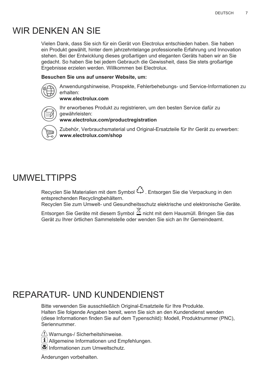 Bitte verwenden Sie ausschließlich Original-Ersatzteile für Ihre Produkte. Halten Sie folgende Angaben bereit, wenn Sie sich an den Kundendienst wenden (diese Informationen finden Sie auf dem Typenschild): Modell, Produktnummer (PNC), Seriennummer. Warnungs-/ Sicherheitshinweise. Allgemeine Informationen und Empfehlungen. Informationen zum Umweltschutz. Änderungen vorbehalten.