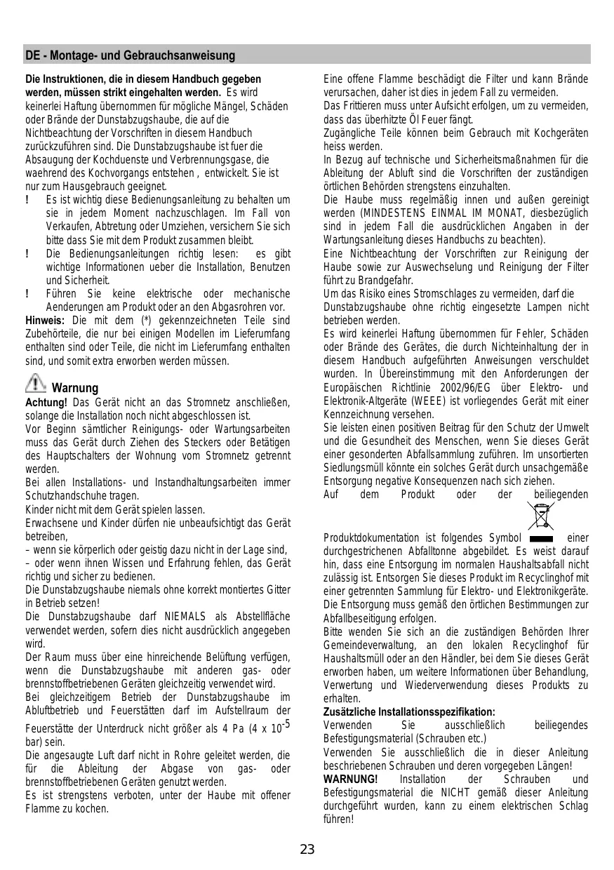 DE - Montage- und Gebrauchsanweisung Eine offene Flamme beschädigt die Filter und kann Brände verursachen, daher ist dies in jedem Fall zu vermeiden. Das Frittieren muss unter Aufsicht erfolgen, um zu vermeiden, dass das überhitzte Öl Feuer fängt. Zugängliche Teile können beim Gebrauch mit Kochgeräten heiss werden. In Bezug auf technische und Sicherheitsmaßnahmen für die Ableitung der Abluft sind die Vorschriften der zuständigen örtlichen Behörden strengstens einzuhalten. Die Haube muss regelmäßig innen und außen gereinigt werden (MINDESTENS EINMAL IM MONAT, diesbezüglich sind in jedem Fall die ausdrücklichen Angaben in der Wartungsanleitung dieses Handbuchs zu beachten). Eine Nichtbeachtung der Vorschriften zur Reinigung der Haube sowie zur Auswechselung und Reinigung der Filter führt zu Brandgefahr. Um das Risiko eines Stromschlages zu vermeiden, darf die Dunstabzugshaube ohne richtig eingesetzte Lampen nicht betrieben werden. Es wird keinerlei Haftung übernommen für Fehler, Schäden oder Brände des Gerätes, die durch Nichteinhaltung der in diesem Handbuch aufgeführten Anweisungen verschuldet wurden. In Übereinstimmung mit den Anforderungen der Europäischen Richtlinie 2002/96/EG über Elektro- und Elektronik-Altgeräte (WEEE) ist vorliegendes Gerät mit einer Kennzeichnung versehen. Sie leisten einen positiven Beitrag für den Schutz der Umwelt und die Gesundheit des Menschen, wenn Sie dieses Gerät einer gesonderten Abfallsammlung zuführen. Im unsortierten Siedlungsmüll könnte ein solches Gerät durch unsachgemäße Entsorgung negative Konsequenzen nach sich ziehen. Auf dem Produkt oder der beiliegenden