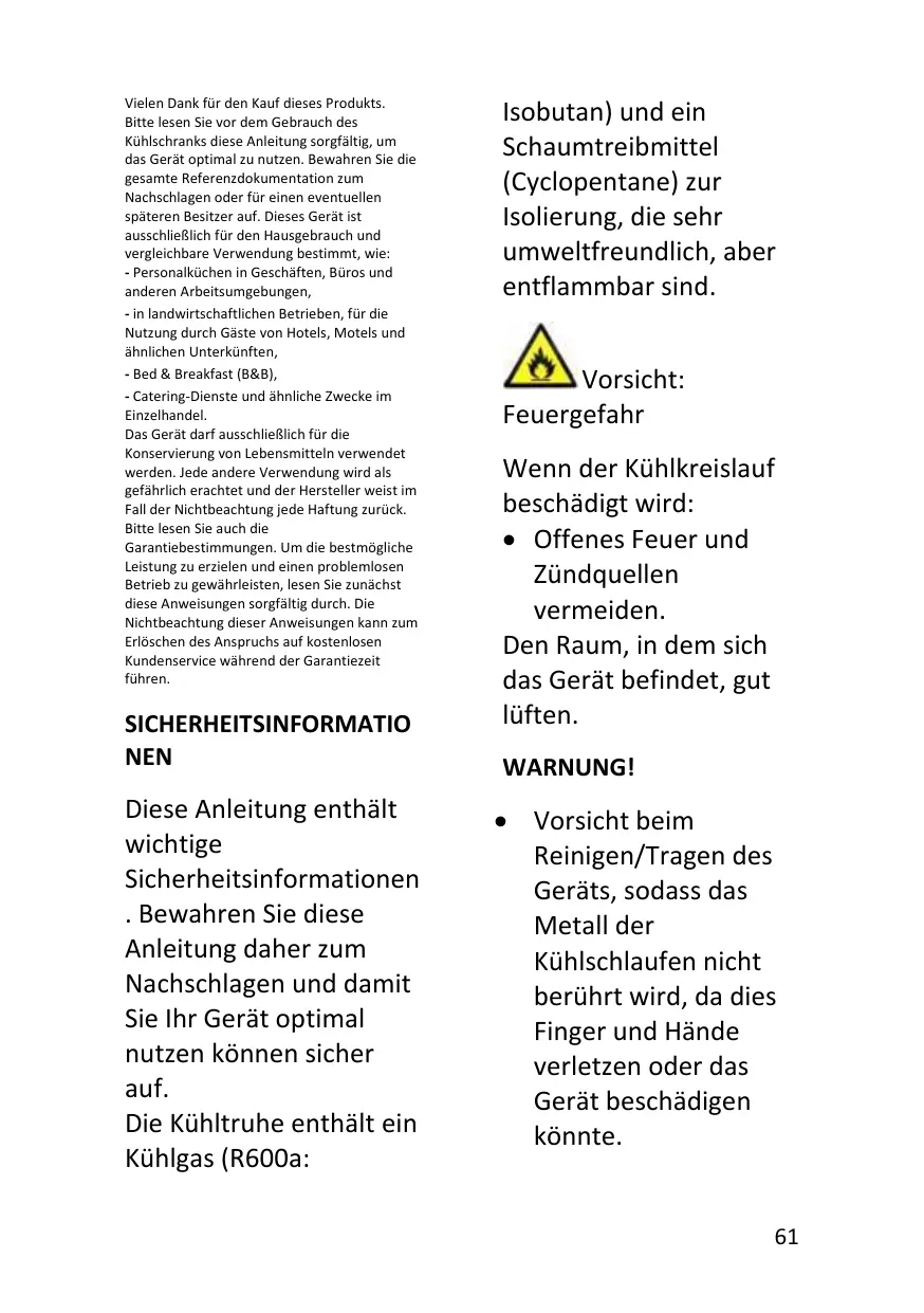Attention : risque d'incendie En cas de dommages du circuit de réfrigérant : • Éviter des flammes ouvertes et des sources d'inflammation. Bien aérer la pièce dans laquelle se trouve l'appareil. AVERTISSEMENT !