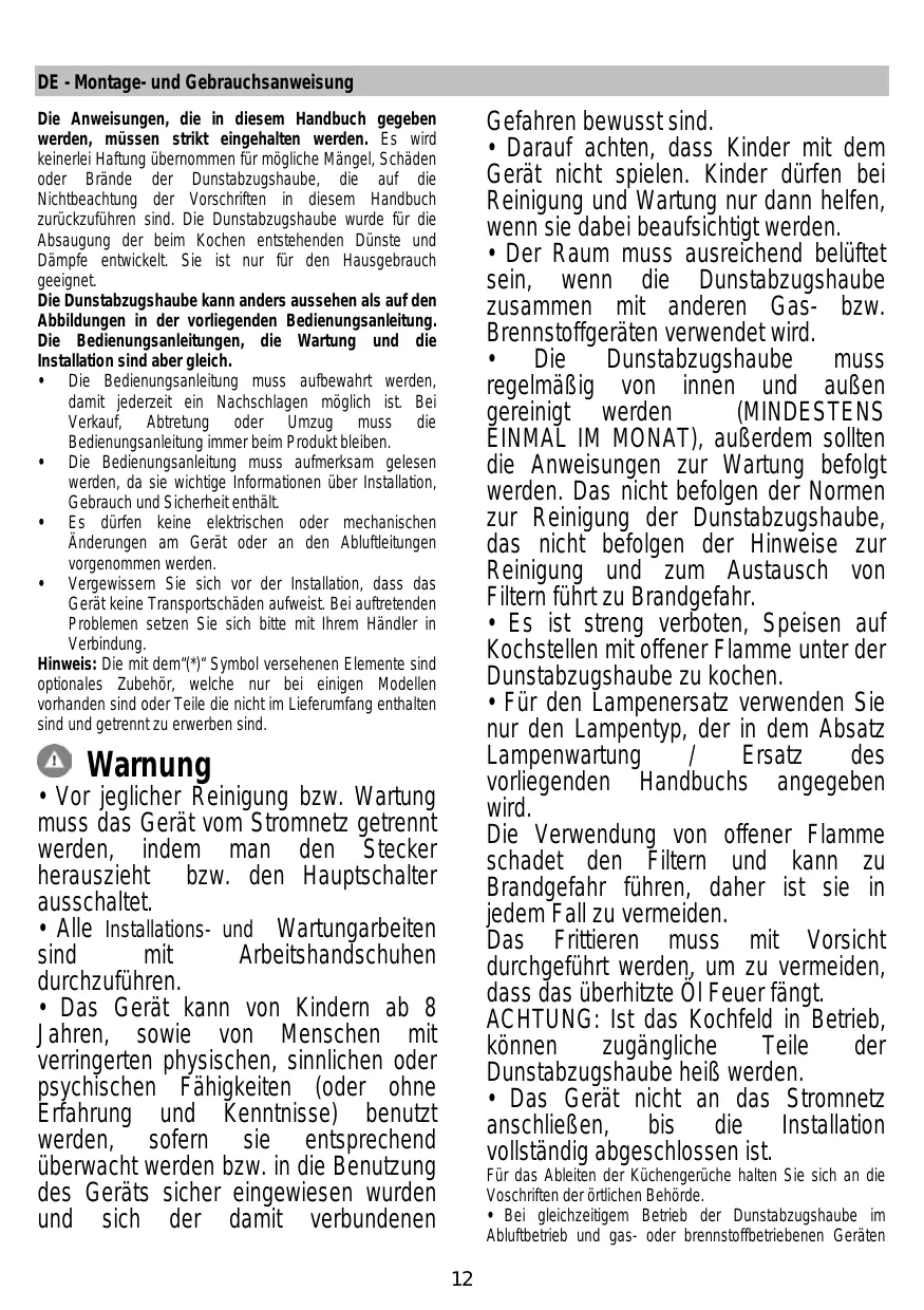 • La hotte doit être régulièrement nettoyée à la fois à l'intérieur et à l'extérieur (AU MOINS UNE FOIS PAR MOIS); cela devrait se faire en conformité avec les instructions d'entretien. Le non respect des instructions expressément fournies concernant le nettoyage de la hotte et des filtres peut provoquer des risques d'incendie. • Ne pas flamber d’aliments sous la hotte. • Pour le remplacement de la lampe, utilisez uniquement le type de lampe spécifié dans la section remplacement/maintenance lampe dans ce manuel. L'utilisation d'une flamme nue est dommageable pour les filtres et peut causer un incendie, par conséquent, il est déconseillé de l'utiliser. La friture doit être faite avec soin afin de s’assurer que l’huile surchauffée ne prenne pas feu. AVERTISSEMENT: Lorsque la table de cuisson est en fonctionnement, les parties accessibles de la hotte peuvent devenir très chaudes. • Ne pas brancher l'appareil au réseau électrique avant que l'installation ne soit complètement terminée.