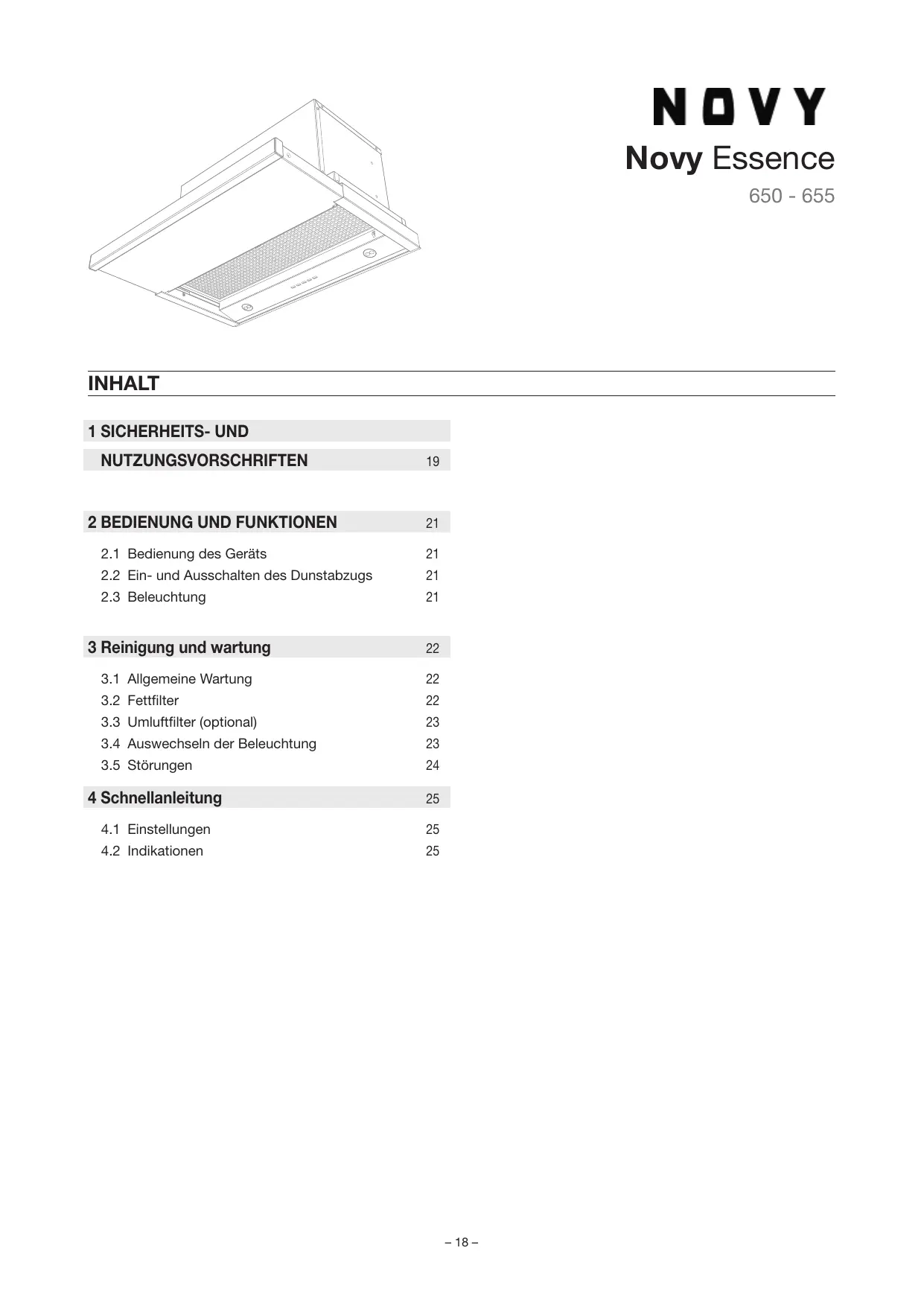 ANZEIGEN EXPOSIERT Vier blinkende LEDs Der Fettfilter muss gereinigt werden Vier LEDs leuchten kontinuierlich Zeit für den Austausch des verwendeten Umluftfilters HINWEIS SEITE Bei Nichtbeachtung der Reinigungshinweise kommt es zu übermäßiger Verschmutzung, Brandgefahr und E zienzverlust. S 22 S 23 – 25 – Novy Essence