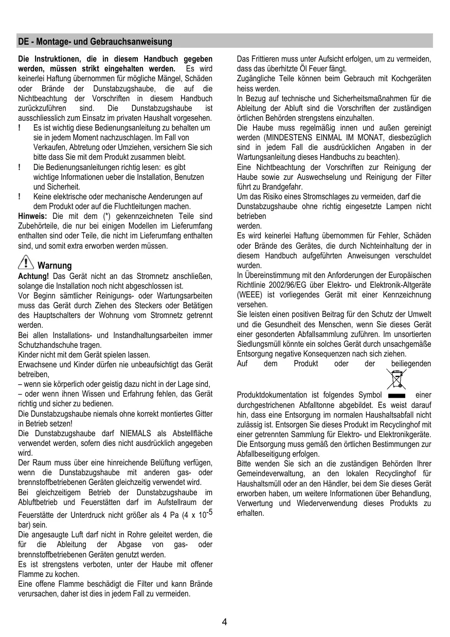 Attention! Ne pas raccorder l’appareil au circuit électrique avant que le montage ne soit complètement terminé. Avant toute opération de nettoyage ou d’entretien, débrancher la hotte du circuit électrique en retirant la prise ou en coupant l’interrupteur général de l’habitation. Munissez-vous de gants de travail avant d’effectuer toute opération d’installation et d’entretien. L’appareil n’est pas destiné à une utilisation par des enfants ou des personnes à capacités physiques, sensorielles ou mentales réduites et sans expérience et connaissance à moins qu’ils ne soient sous la supervision ou formés sur l’utilisation de l’appareil par une personne responsable de leur sécurité. Les enfants doivent être surveillés afin qu’ils ne jouent pas avec l’appareil. Ne jamais utiliser la hotte sans que la grille ne soit montée correctement! La hotte ne doit JAMAIS être utilisée comme plan pour déposer quelque chose sauf si cela est expressément indiqué. Quand la hotte est utilisée en même temps que d’autres appareils à combustion de gaz ou d’autres combustibles, le local doit disposer d’une ventilation suffisante. L’air aspiré ne doit jamais être envoyé dans un conduit utilisé pour l’évacuation des fumées produites par des appareils à combustion de gaz ou d’autres combustibles. Il est formellement interdit de faire flamber les aliments sous la hotte. L’utilisation de flammes libres peut entraîner des dégâts aux filtres et peut donner lieu à des incendies, il faut donc les éviter à tout prix. La friture d’aliments doit être réalisée sous contrôle pour éviter que l’huile surchauffée ne prenne feu. Les pièces accessibles peuvent se réchauffer de façon importante quand elles sont utilisées avec des appareils pour la cuisson.