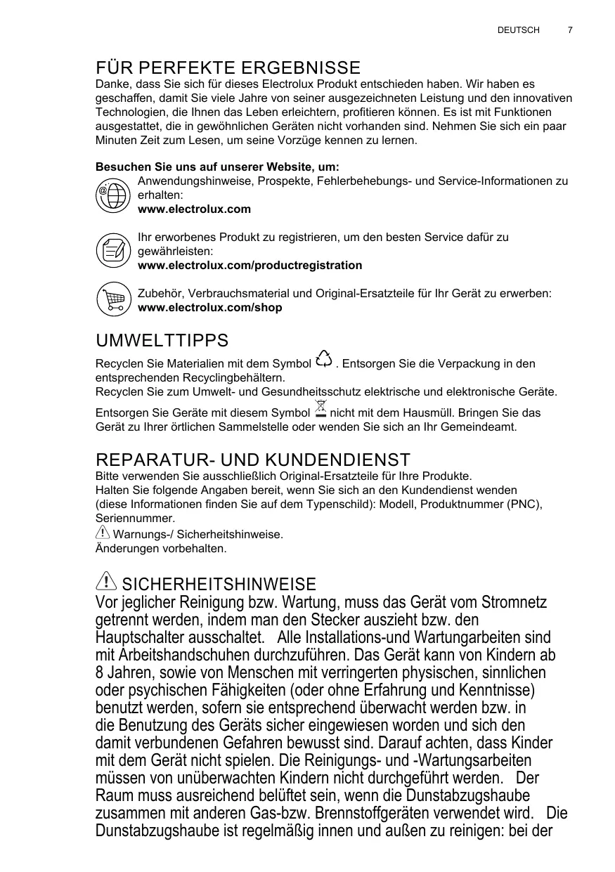 FÜR PERFEKTE ERGEBNISSE Danke, dass Sie sich für dieses Electrolux Produkt entschieden haben. Wir haben es geschaffen, damit Sie viele Jahre von seiner ausgezeichneten Leistung und den innovativen Technologien, die Ihnen das Leben erleichtern, profitieren können. Es ist mit Funktionen ausgestattet, die in gewöhnlichen Geräten nicht vorhanden sind. Nehmen Sie sich ein paar Minuten Zeit zum Lesen, um seine Vorzüge kennen zu lernen. Besuchen Sie uns auf unserer Website, um: Anwendungshinweise, Prospekte, Fehlerbehebungs- und Service-Informationen zu erhalten: www.electrolux.com Ihr erworbenes Produkt zu registrieren, um den besten Service dafür zu gewährleisten: www.electrolux.com/productregistration Zubehör, Verbrauchsmaterial und Original-Ersatzteile für Ihr Gerät zu erwerben: www.electrolux.com/shop
