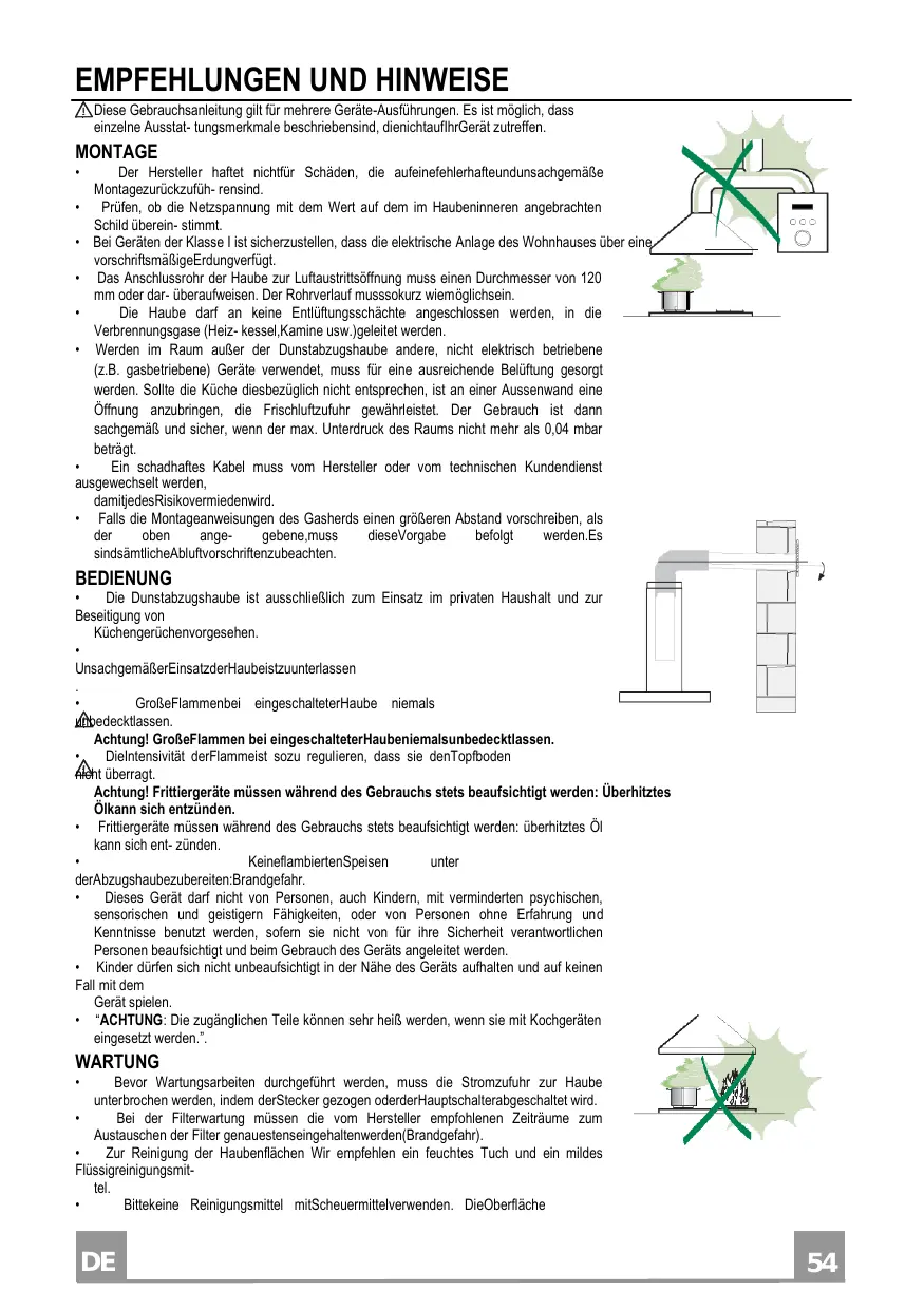 • • Ne pas laisser les flammes libres à forte intensité quand la hotte est en service. • Toujours régler les flammes de manière à éviter toute sortie latérale de ces dernières par rapport au fond des marmites. • Contrôler les friteuses lors de l’utilisation car l’huile surchauffée pourrait s’enflammer. • Ne pas préparer d’aliments flambés sous la hotte de cuisine : risque d’incendie • Cet appareil ne doit pas être utilisé par des personnes (y compris les enfants) ayant des capacités psychiques, sensorielles ou mentales réduites, ni par des personnes n’ayant pas l’expérience et la connaissance de ce type d’appareils, à moins d'être sous le contrôle et la formation de personnes responsables de leur sécurité. • Les enfants doivent être surveillés pour s'assurer qu'ils ne jouent pas avec l'appareil. • « ATTENTION : Les parties accessibles peuvent devenir très chaudes si utilisées avec des appareils de cuisson. »