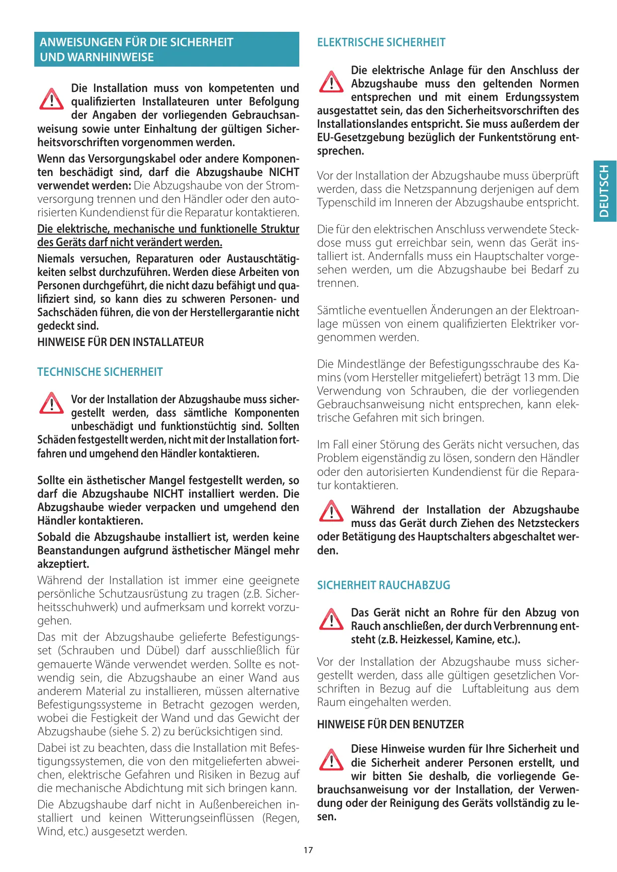 ADVERTENCIAS PARA EL INSTALADOR SEGURIDAD TÉCNICA Antes de instalar la campana controle la integridad y funcionalidad de cada una de sus partes: si se notan anomalías no realice la instalación y póngase en contacto con el revendedor.