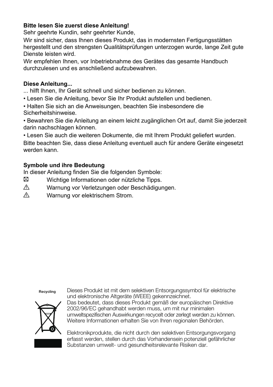 Bitte lesen Sie zuerst diese Anleitung! Sehr geehrte Kundin, sehr geehrter Kunde, Wir sind sicher, dass Ihnen dieses Produkt, das in modernsten Fertigungsstätten hergestellt und den strengsten Qualitätsprüfungen unterzogen wurde, lange Zeit gute Dienste leisten wird. Wir empfehlen Ihnen, vor Inbetriebnahme des Gerätes das gesamte Handbuch durchzulesen und es anschließend aufzubewahren. Diese Anleitung... ... hilft Ihnen, Ihr Gerät schnell und sicher bedienen zu können.