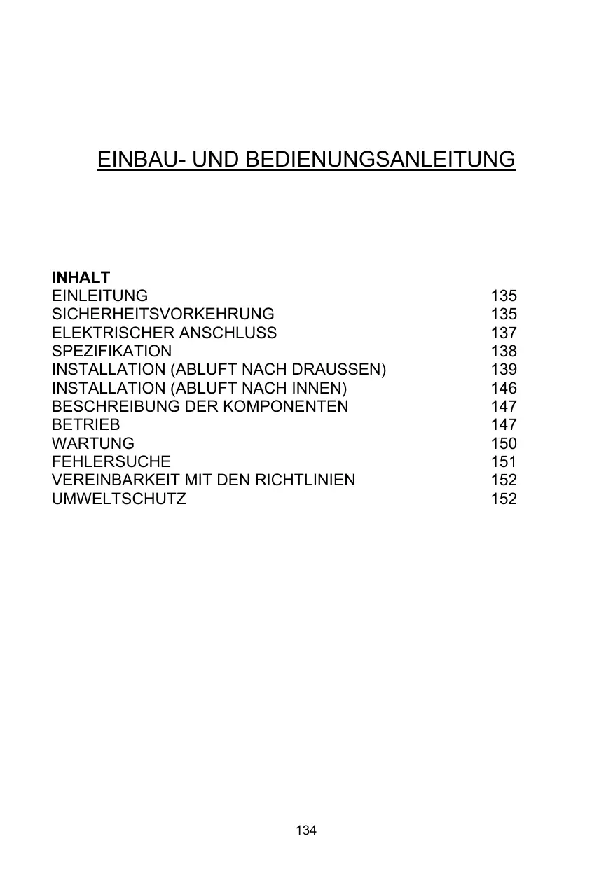 EINBAU- UND BEDIENUNGSANLEITUNG INHALT EINLEITUNG SICHERHEITSVORKEHRUNG ELEKTRISCHER ANSCHLUSS SPEZIFIKATION INSTALLATION (ABLUFT NACH DRAUSSEN) INSTALLATION (ABLUFT NACH INNEN) BESCHREIBUNG DER KOMPONENTEN BETRIEB WARTUNG FEHLERSUCHE VEREINBARKEIT MIT DEN RICHTLINIEN UMWELTSCHUTZ