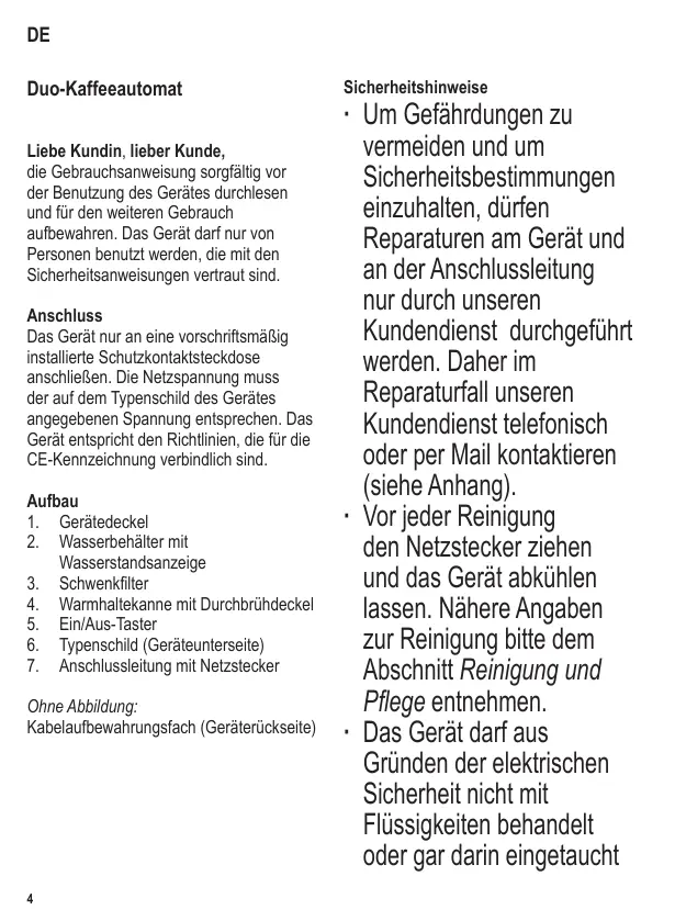 DE Duo-Kaffeeautomat Liebe Kundin, lieber Kunde, die Gebrauchsanweisung sorgfältig vor der Benutzung des Gerätes durchlesen und für den weiteren Gebrauch aufbewahren. Das Gerät darf nur von Personen benutzt werden, die mit den Sicherheitsanweisungen vertraut sind. Anschluss Das Gerät nur an eine vorschriftsmäßig installierte Schutzkontaktsteckdose anschließen. Die Netzspannung muss der auf dem Typenschild des Gerätes angegebenen Spannung entsprechen. Das Gerät entspricht den Richtlinien, die für die CE-Kennzeichnung verbindlich sind. Aufbau 1. Gerätedeckel 2. Wasserbehälter mit Wasserstandsanzeige 3. Schwenkfilter 4. Warmhaltekanne mit Durchbrühdeckel 5. Ein/Aus-Taster 6. Typenschild (Geräteunterseite) 7. Anschlussleitung mit Netzstecker Ohne Abbildung: Kabelaufbewahrungsfach (Geräterückseite)